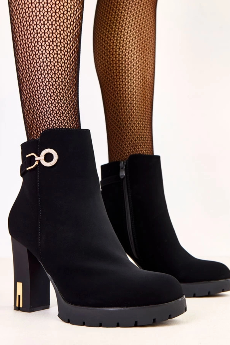 Botins elegantes pretos com salto em formato de coluna e decoração Verona
