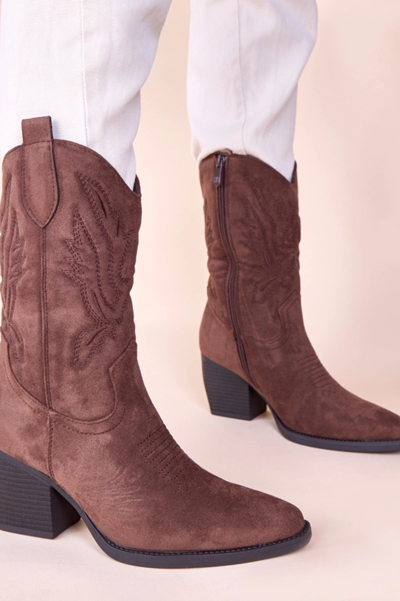 Botas de cowboy marrons de cano curto com aplicação bordada decorativa Cassa