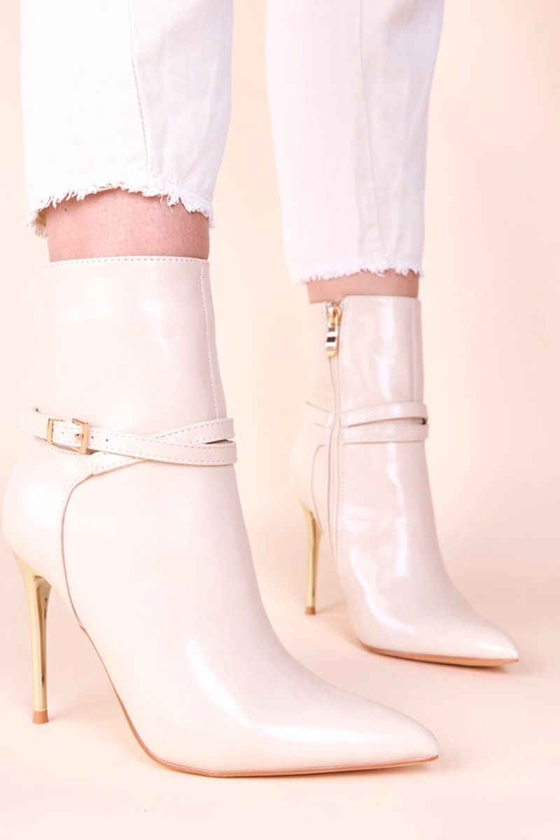 Botas de cano curto em tom areia em salto dourado com brilho Carmila