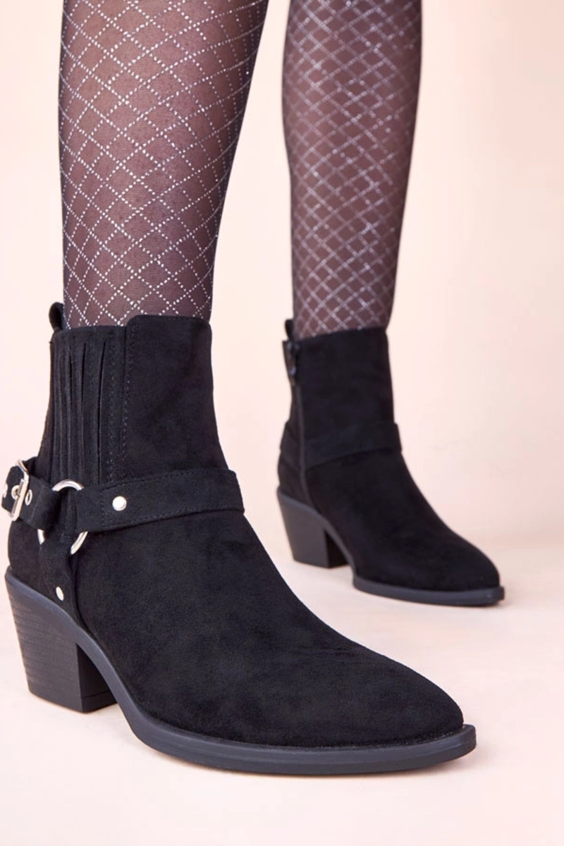 Botas de cano curto pretas em salto com fivelas decorativas Ritama