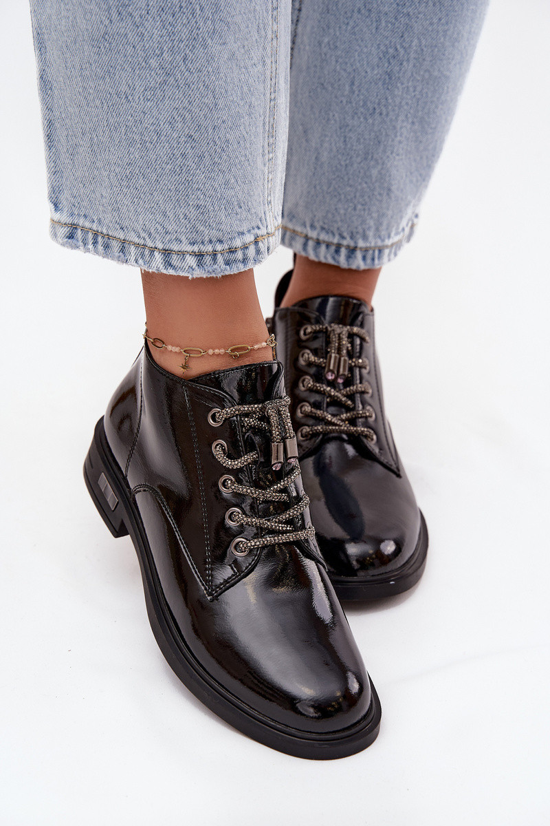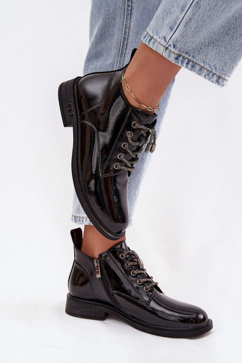 Botas femininas de pele sintética com efeito envernizado e amarrações sofisticadas D&A MR52-124 na cor preta