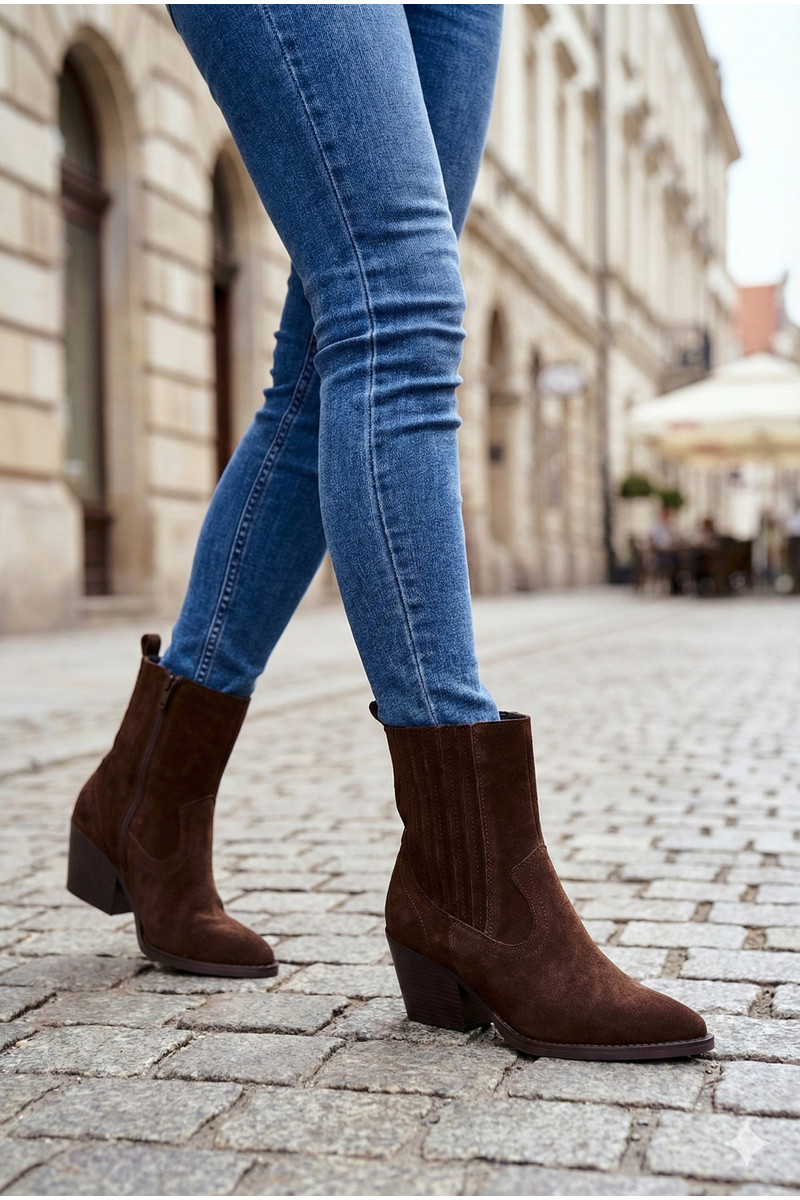 Bota de cowboy feminina em camurça marrom com salto, forrada Dylira