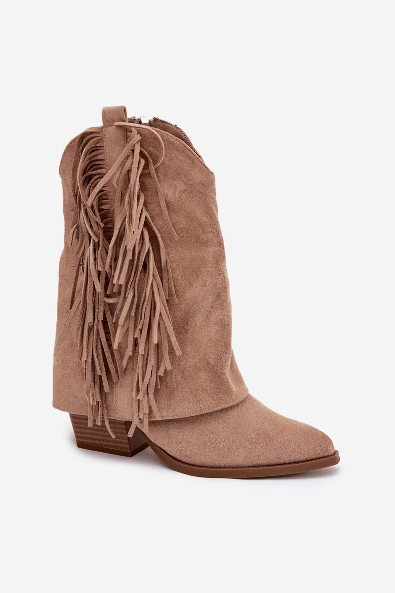 Botins femininos na cor caqui estilo cowboy com franjas e saltinhos Gralina