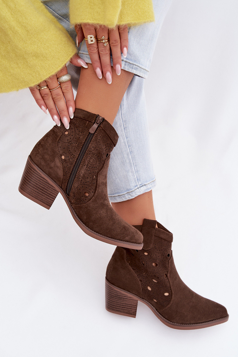 Botins femininos de estilo cowboy com elementos vazados na cor chocolate Nolvina