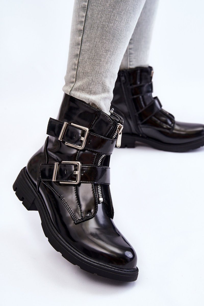 Botas femininas forradas de cano curto com saltos largos e zíper na cor preta Joshie