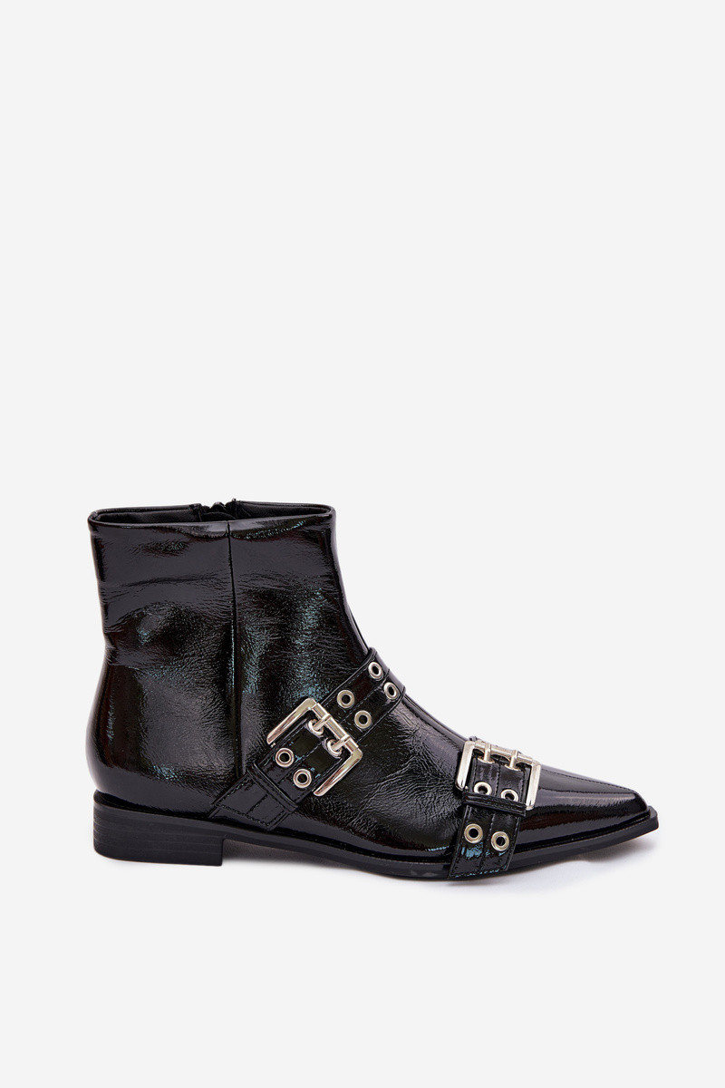 com efeito verniz Botas femininas com salto largo com listras I com fivelasmi cor preta Hamira