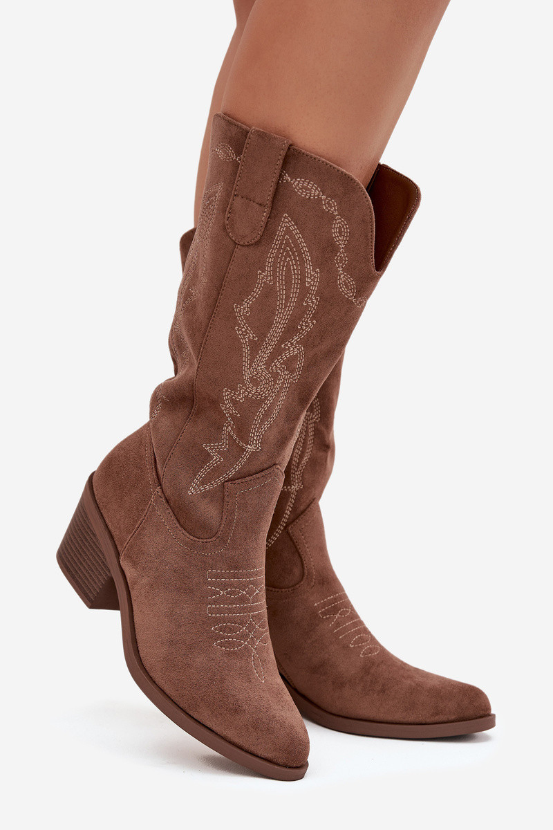 Botas femininas altas em estilo cowboy com saltos aquecidos Vinceza 16508 na cor areia