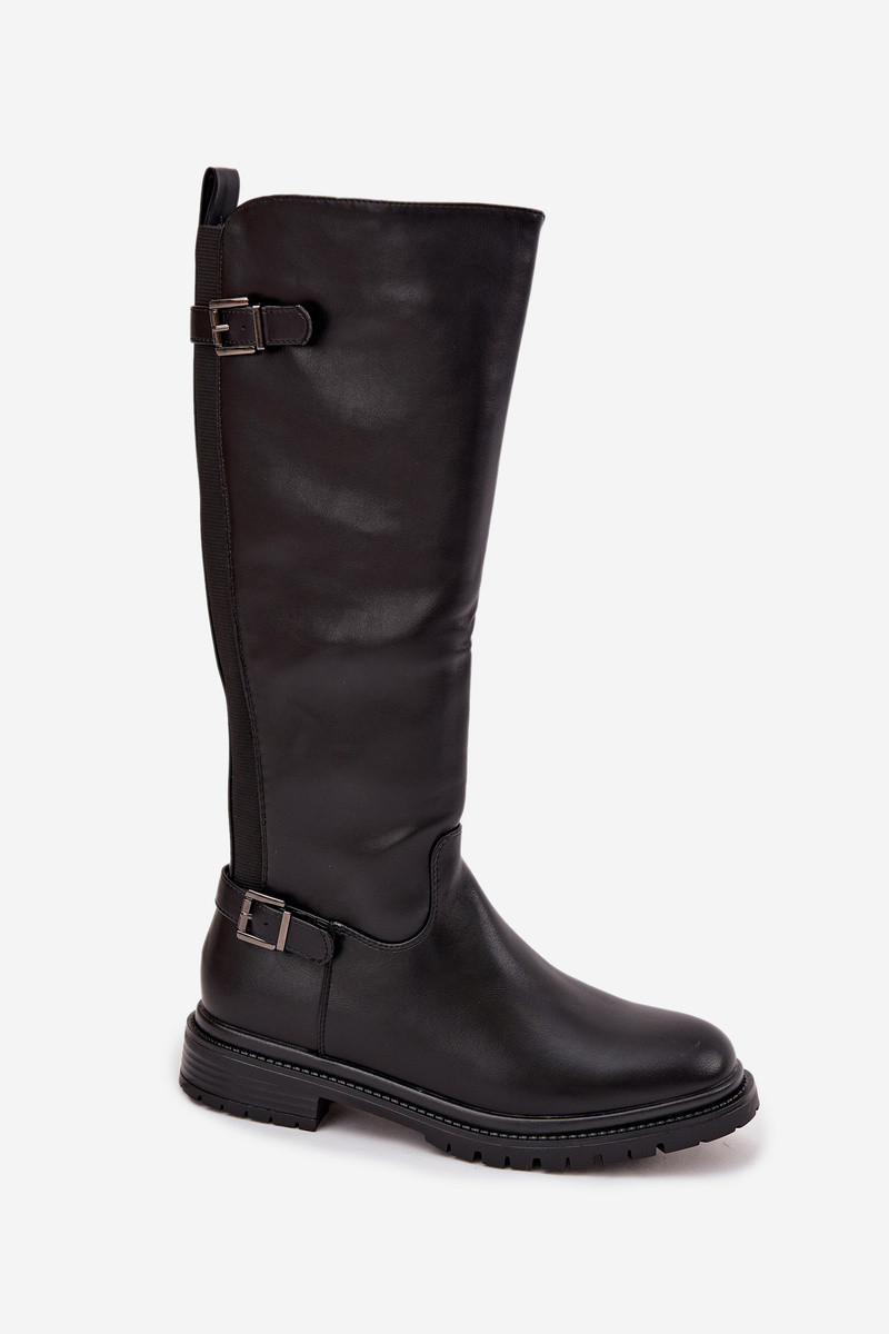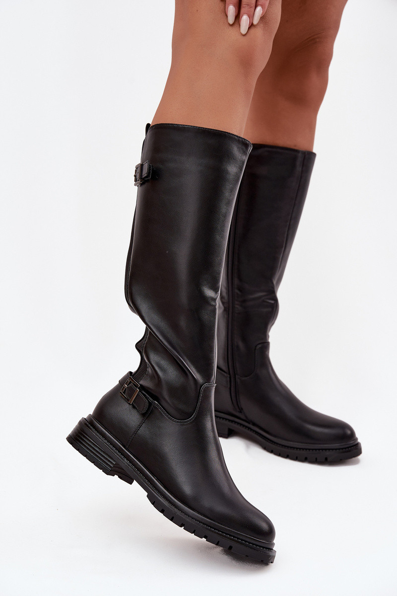 Botas femininas de cano longo com saltos largos e fivelas, cor preta, Sorelle