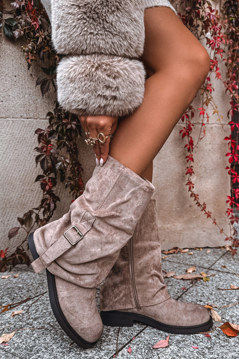 Botas de cano alto femininos com detalhe na tornozelo na altura da panturrilha com fivelas na cor chique Minelle