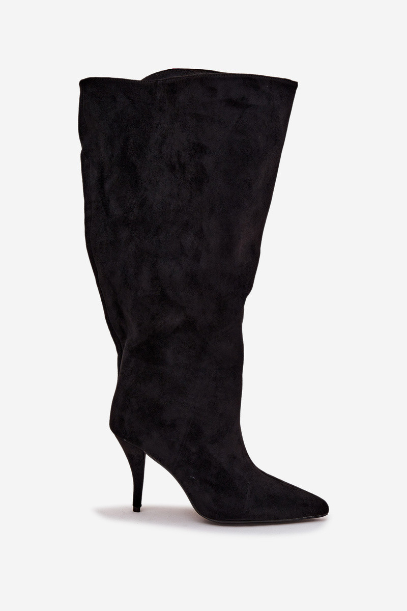 Botas de cano alto femininos slip-on com saltos finos de camurça sintética na cor preta Noretta