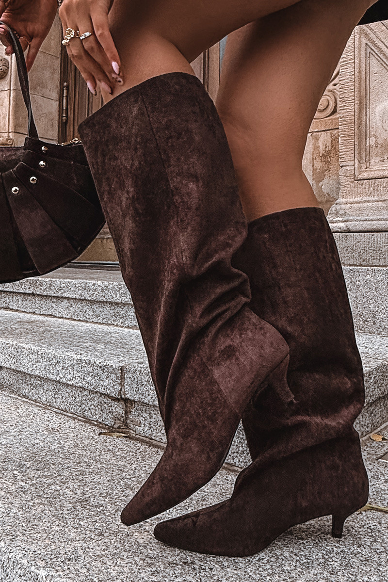 Botas de cano alto femininas com saltos de camurça sintética na cor chocolate Pheona