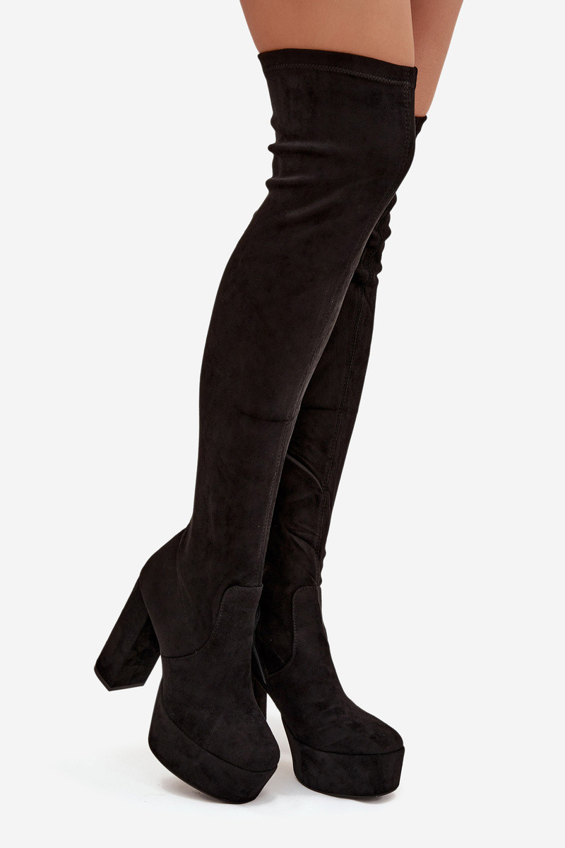 botas com salto e plataforma acima do joelho de camurça ecológicaoParae cor preta Amareen