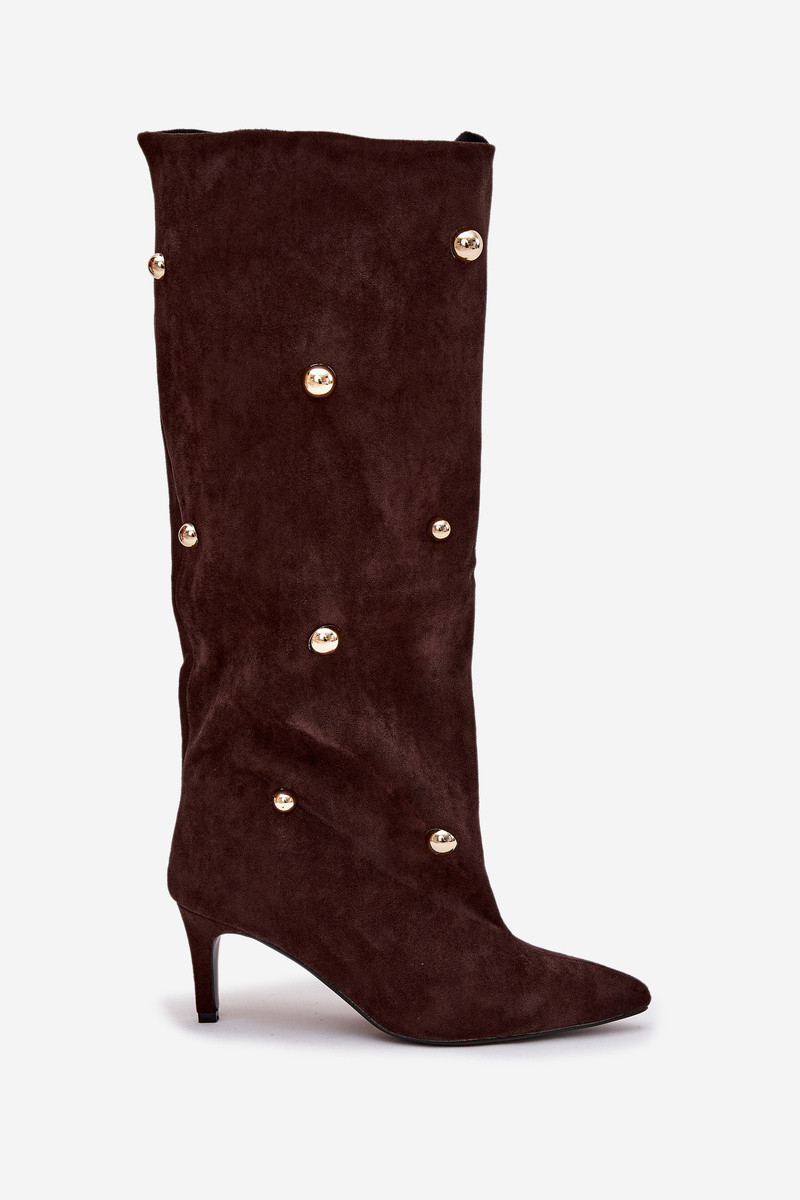 Um modelo atraente botas femininas com salto fino Ze cor douradami Ozdobami CzekoladoParae Thaliane
