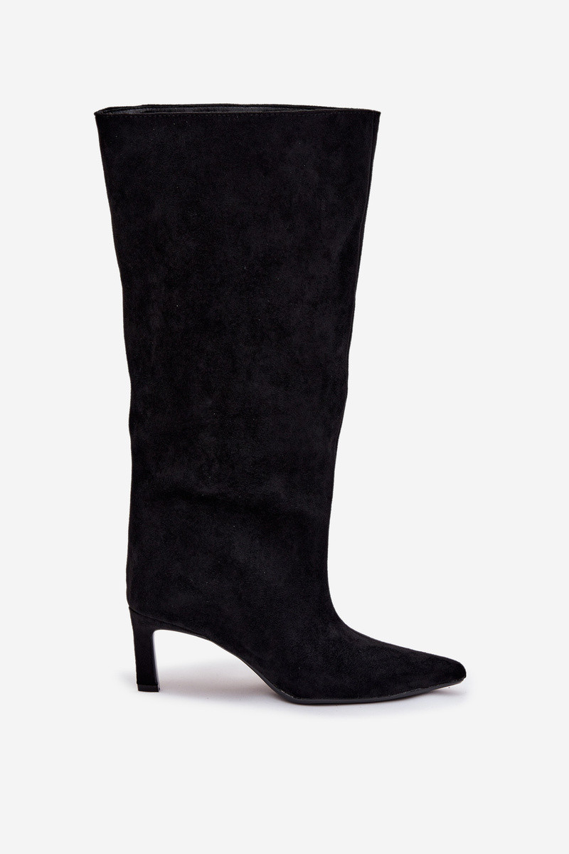 Botas de cano longo femininas em camurça sintética, modelo slip-on com saltos finos, na cor preta Phelin