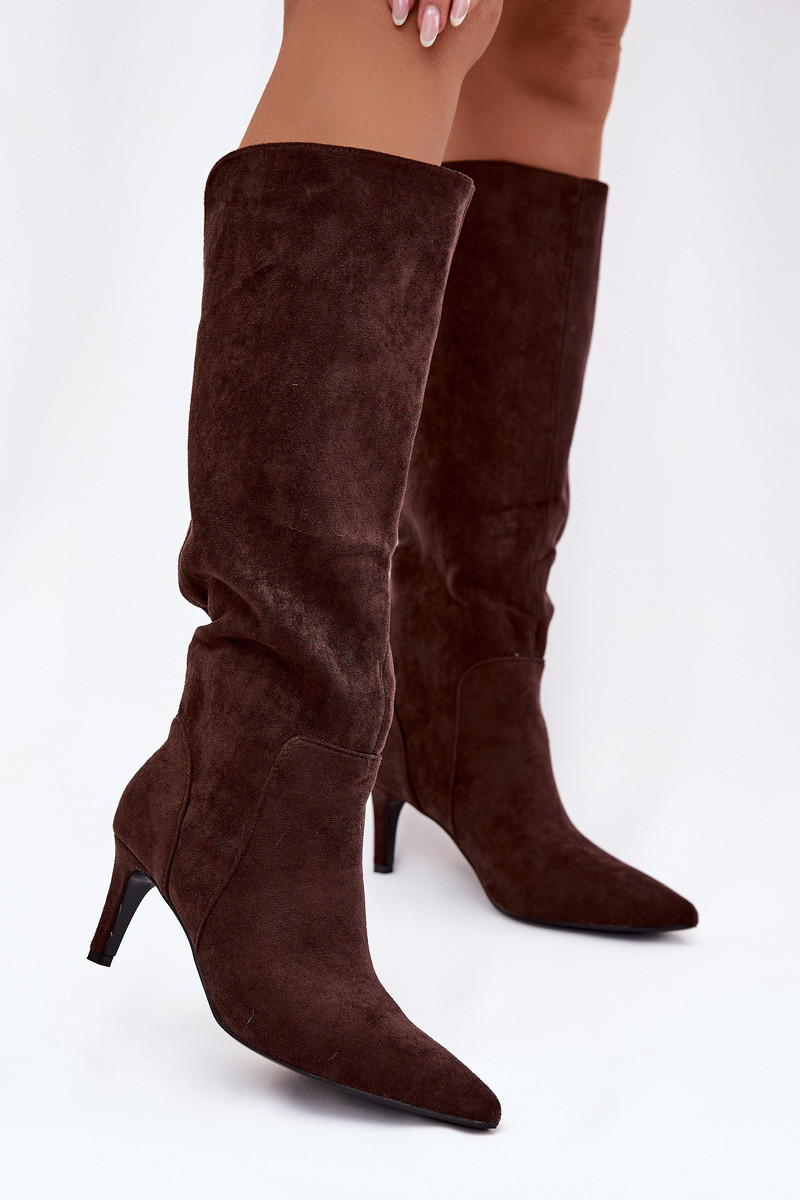 Botas de cano longo femininas em tom chocolate quentes com saltos finos em camurça sintética Arelisse