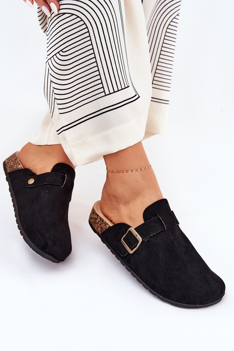 Chinelos Tamancos Feminino i com uma plataforma com fivelas cor preta Selio