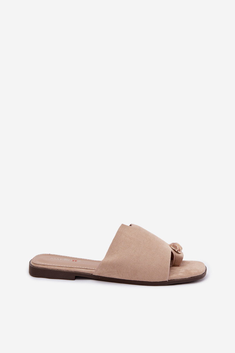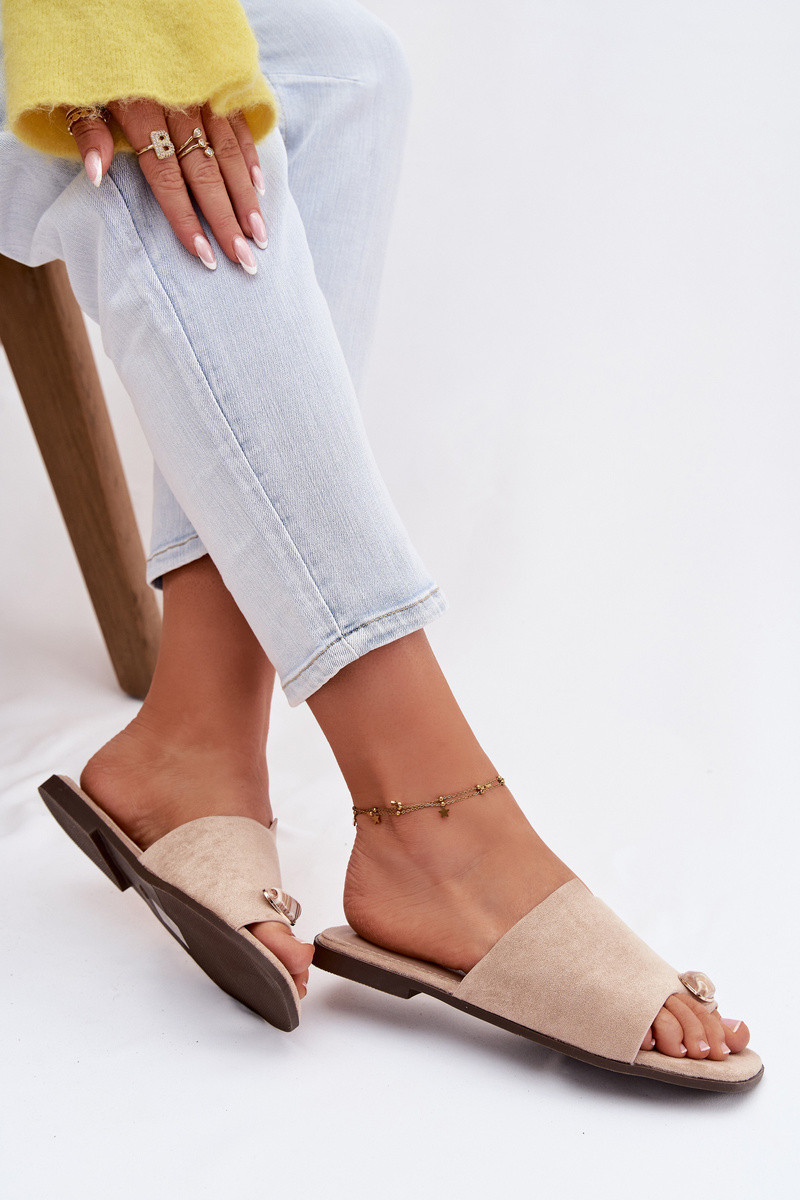 Chinelos femininos baixos com detalhes decorativos de camurça sintética, cor areia, Selavine