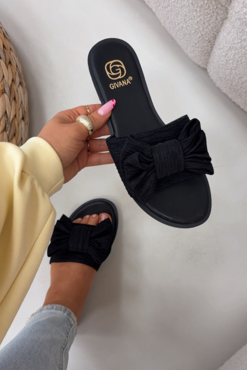 Chinelos femininos pretos com saltos largos e laços Amivelle