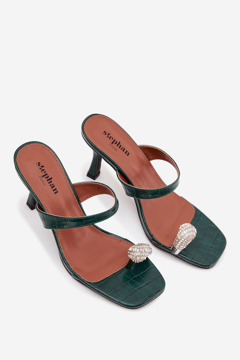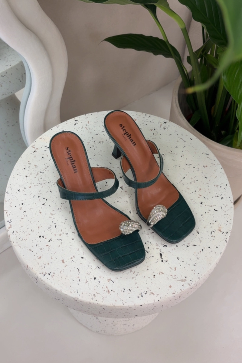 Chinelos femininos na cor verde garrafa com saltos finos e detalhes decorativos Lorissa