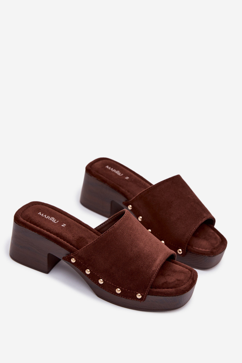Chinelos femininos tipo clogs com pinos dourados na cor chocolate Davessa