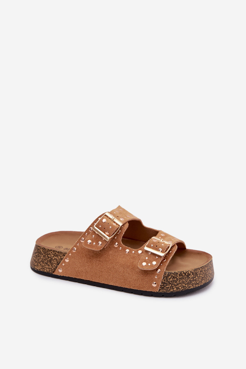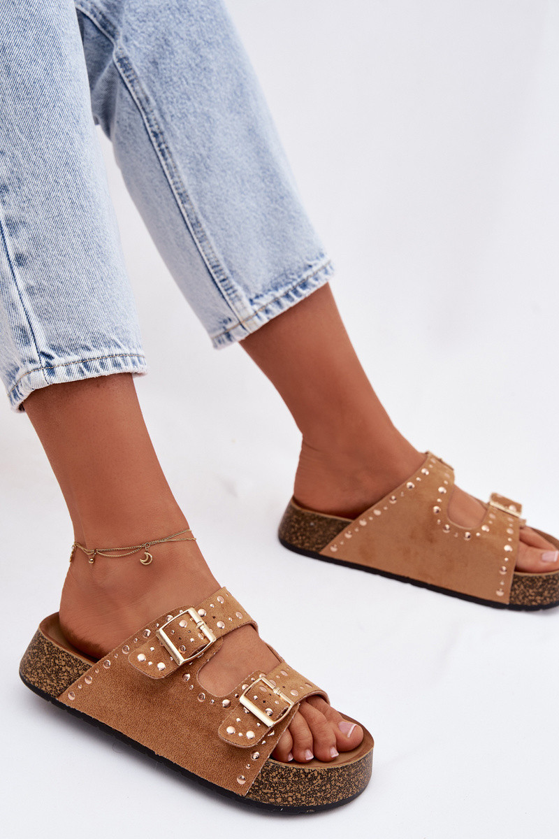 Chinelos femininos dourados com fivelas e tachas cor marrom Tervina