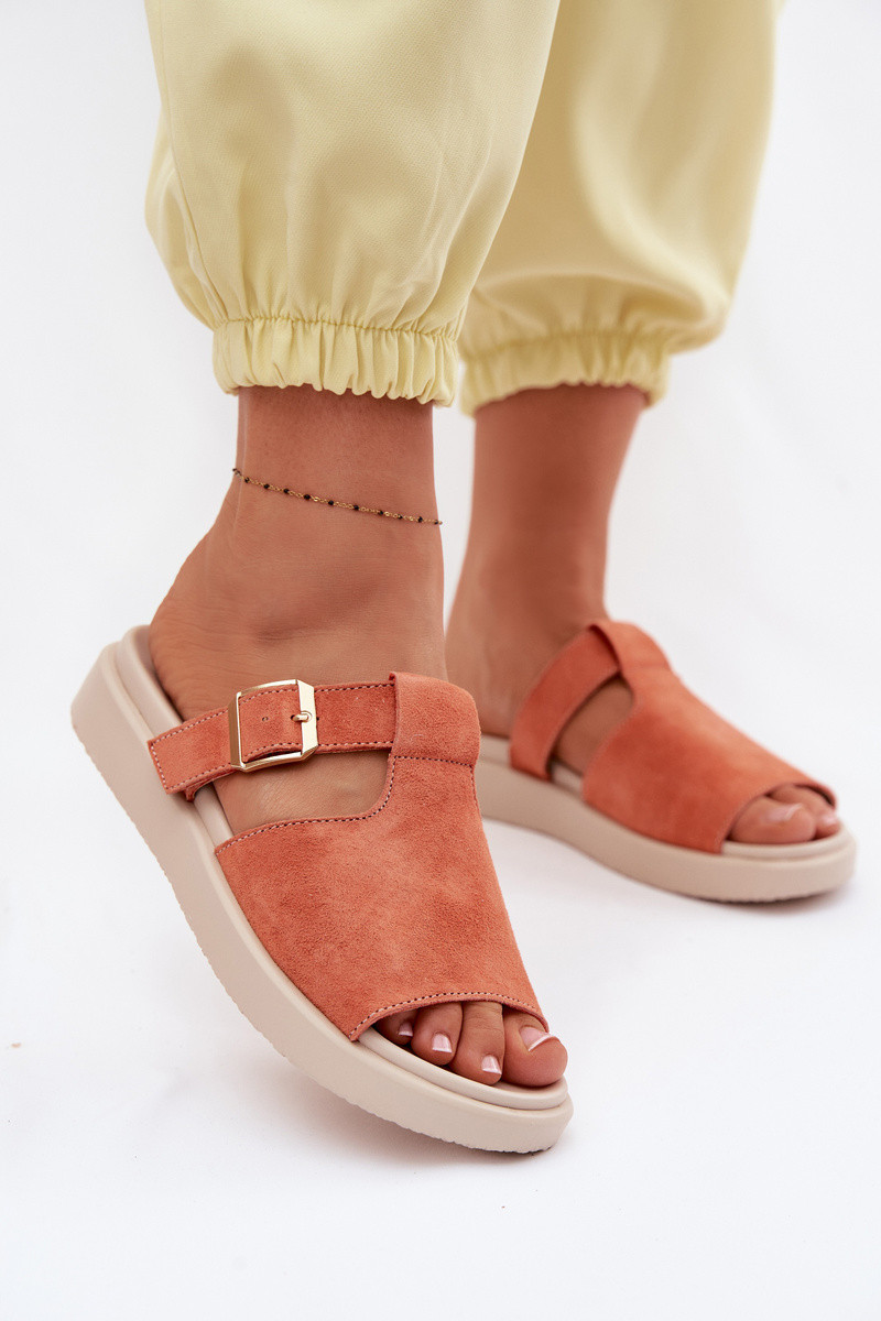 Chinelos femininos de camurça com plataforma e fivelas douradas Zemela cor laranja