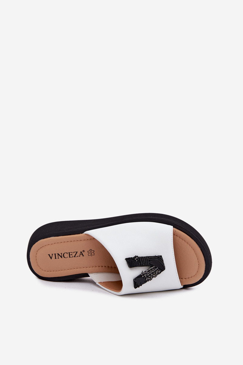 Chinelos de couro FemininoLiterą V com uma plataforma Vinceza 66950 cor branca