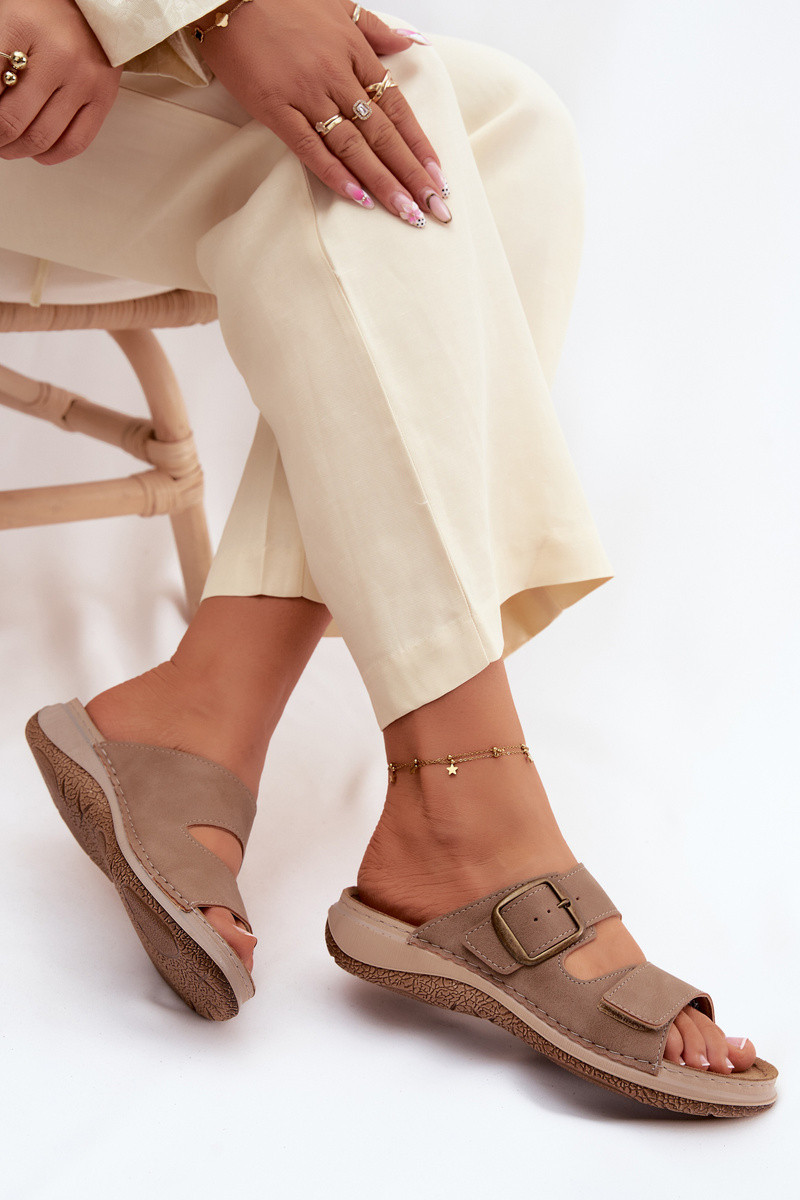 Chinelos femininos com fivelas e fecho adesivo em marrom