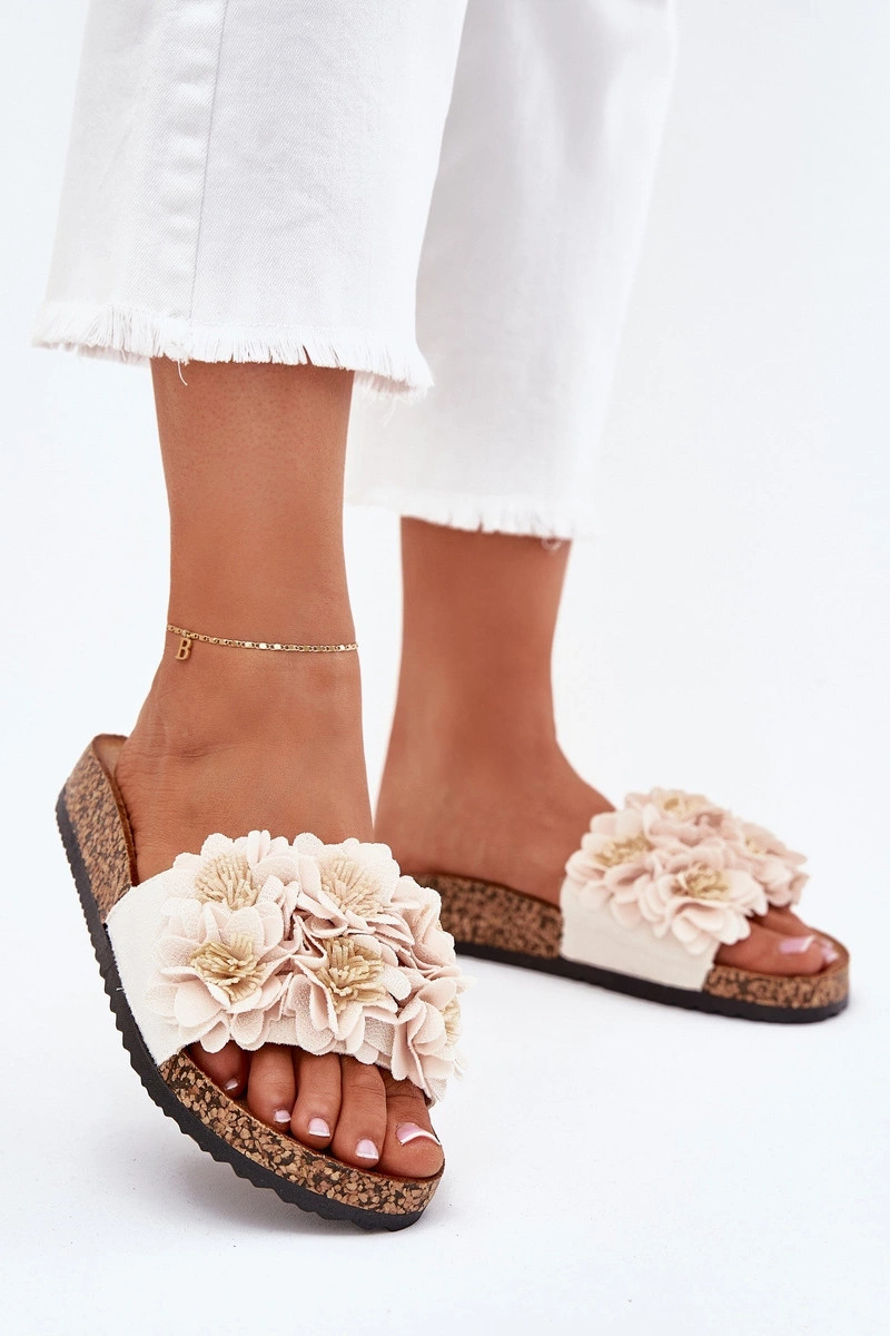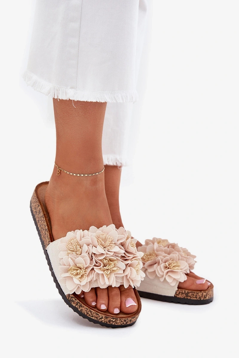 Chinelos de pele sintética rosa em sola de cortiça com motivos florais Seleneza