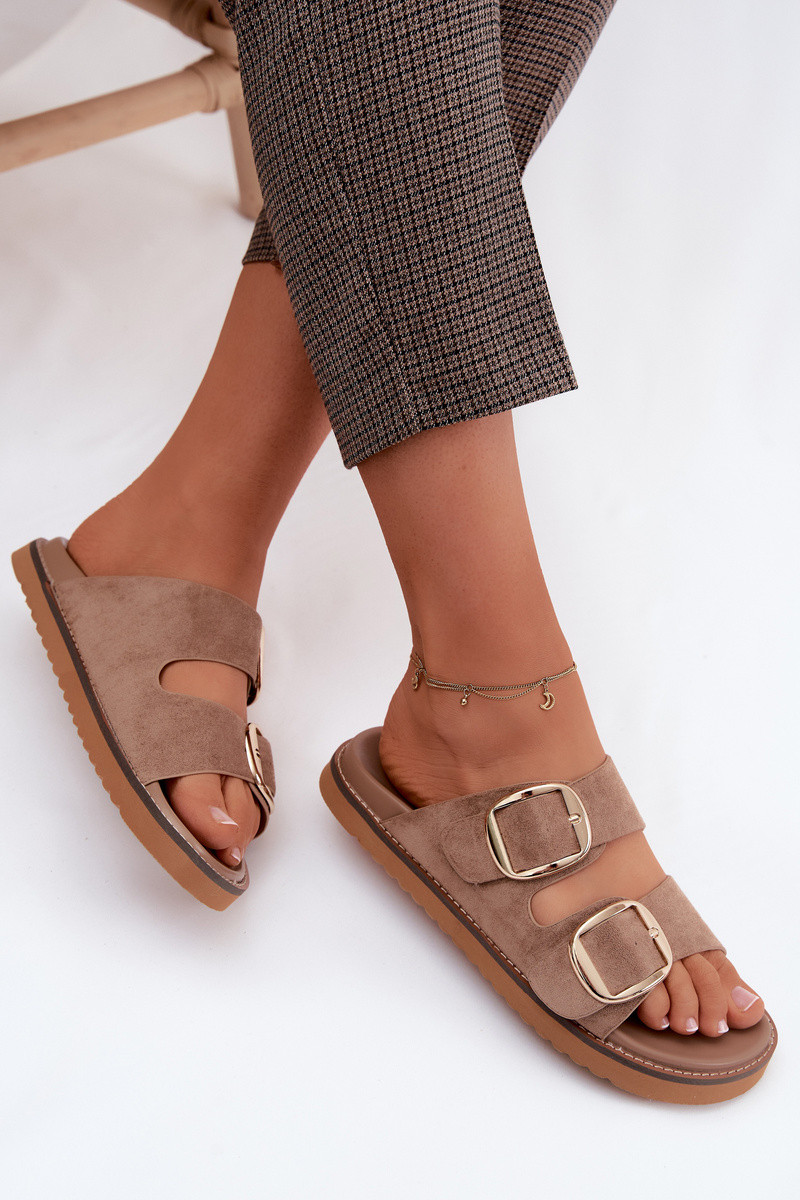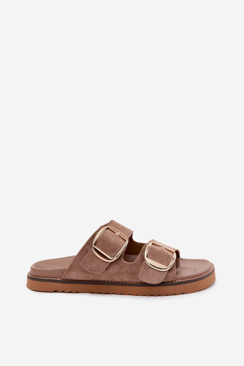 Chinelos femininosImitacji de camurçau cor dourada com fivelas cor marrom Averia