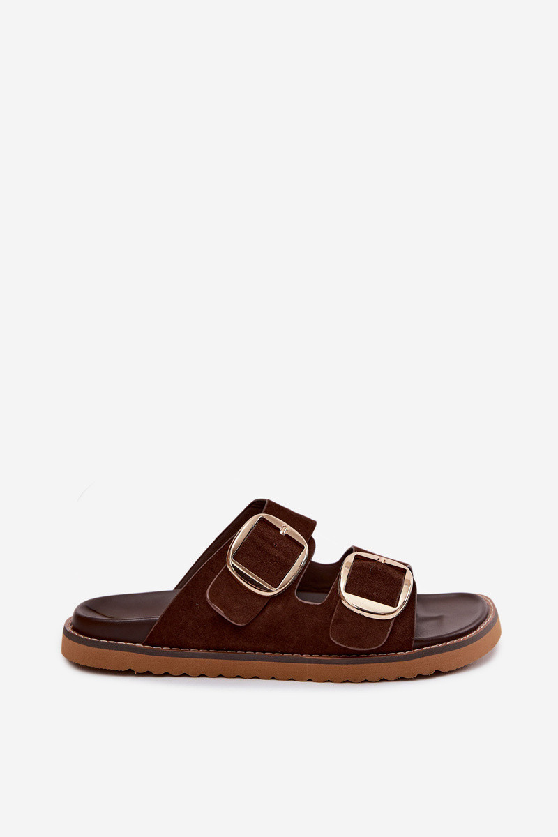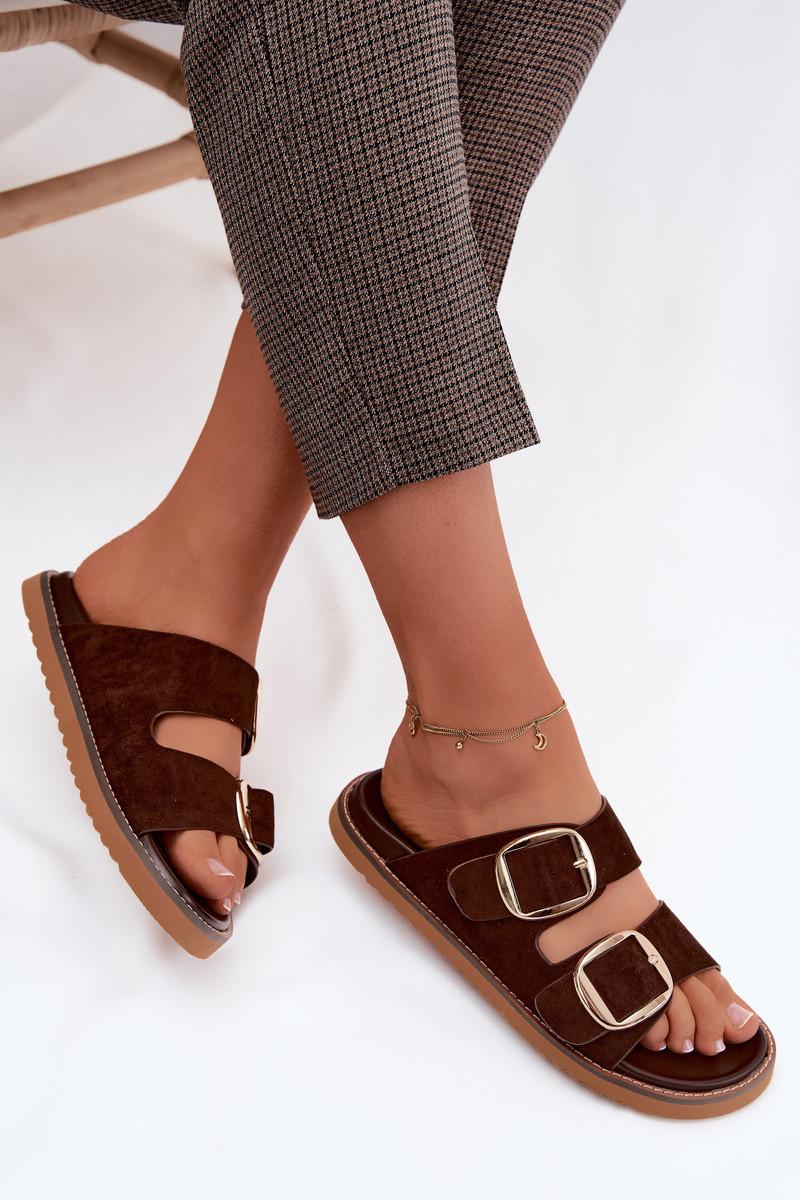 Chinelos femininosImitacji de camurçau cor dourada com fivelas cor cáqui Averia