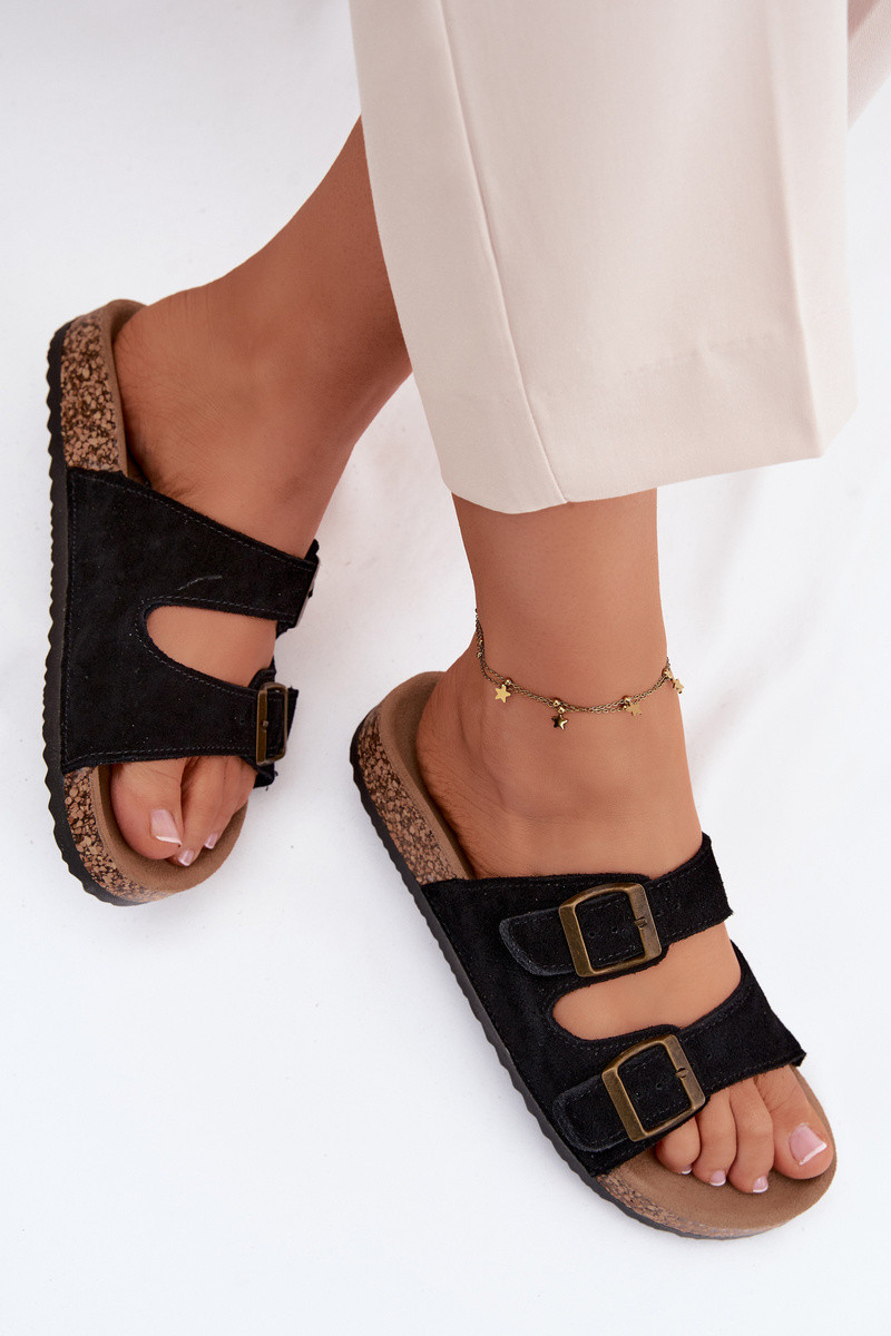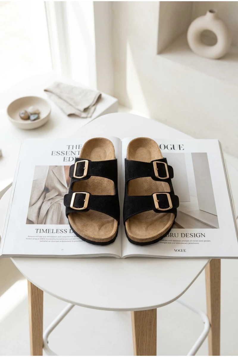 Chinelos de camurça marrons em sola de cortiça com fivelas Tavira