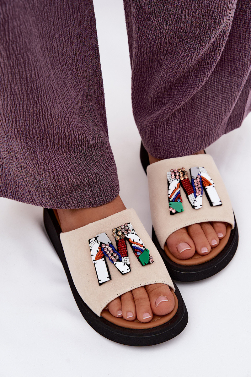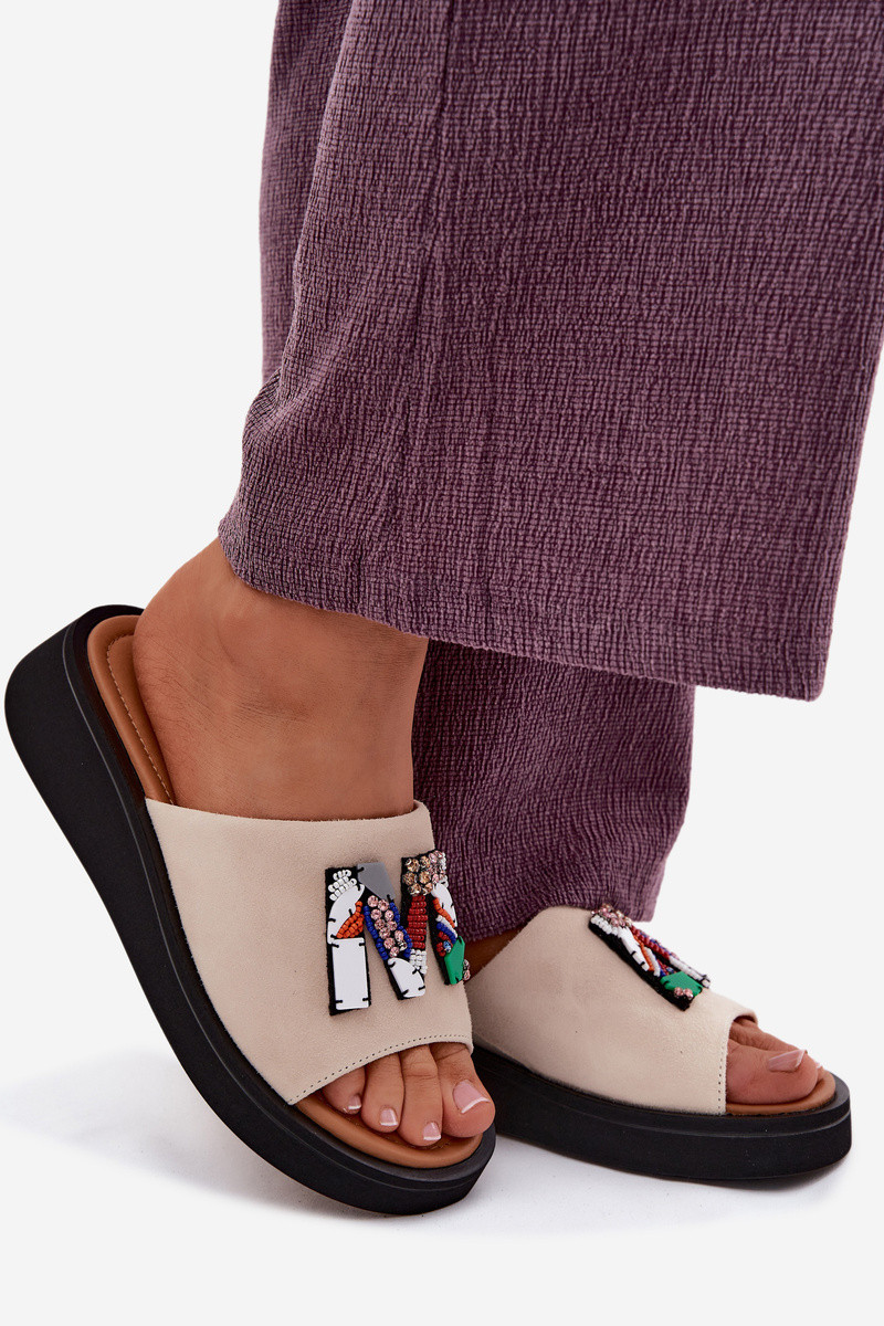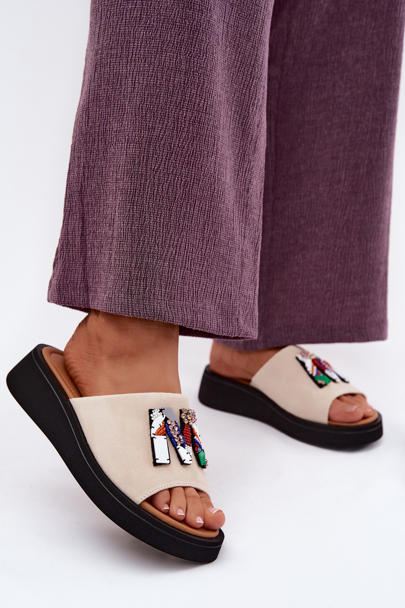 Pele Chinelos femininos de camurça com enfeites com uma plataforma Vinceza 66942 bege
