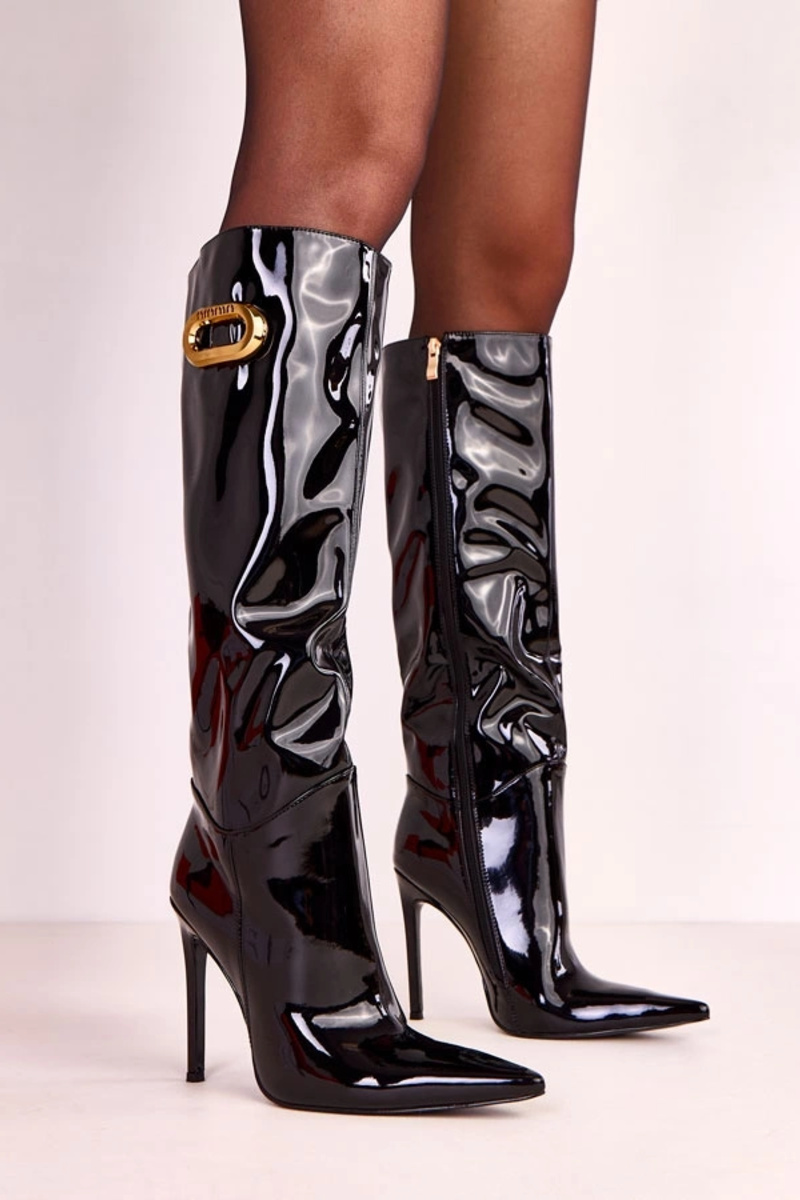 Botas femininas pretas envernizadas com detalhes dourados Herrera
