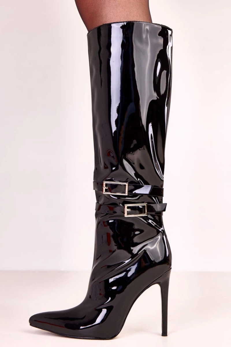 Botas femininas pretas envernizadas com fivela decorativa Asheris