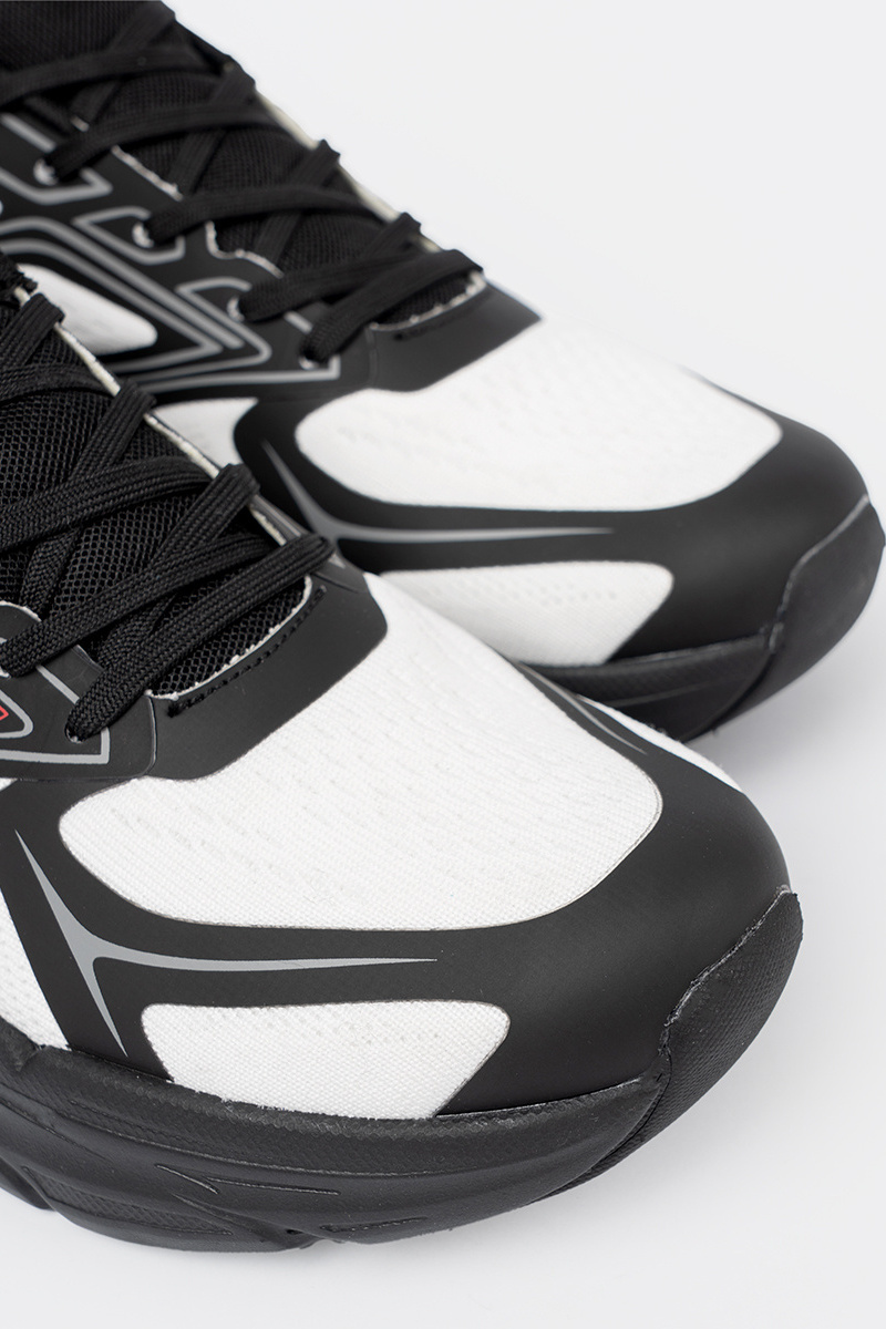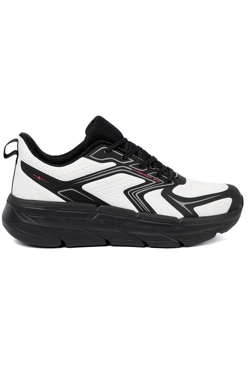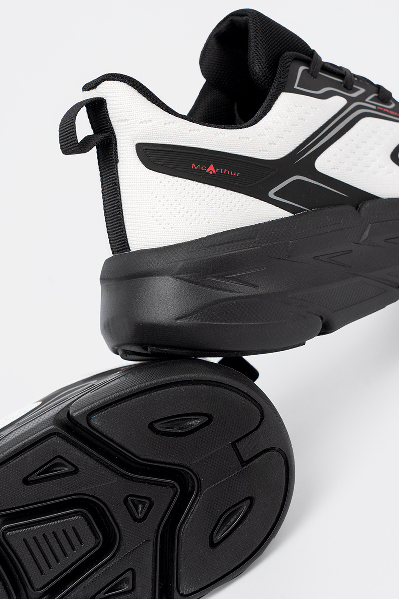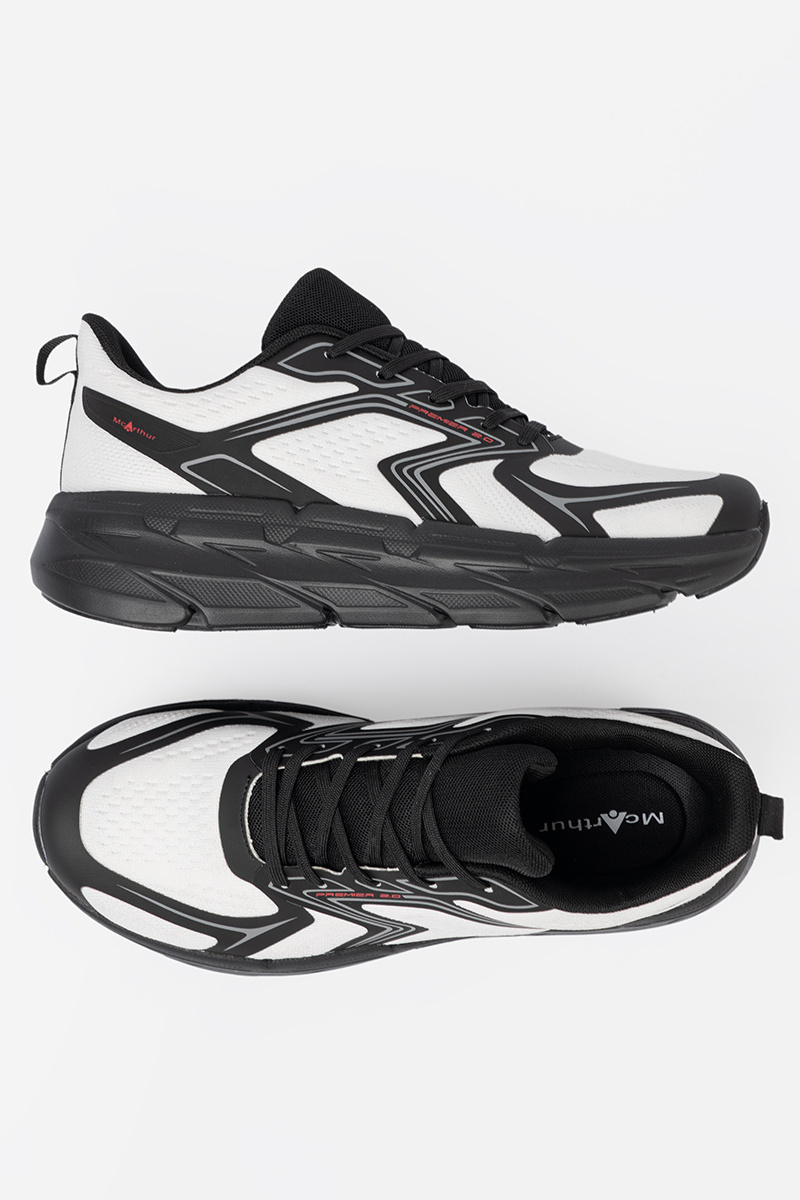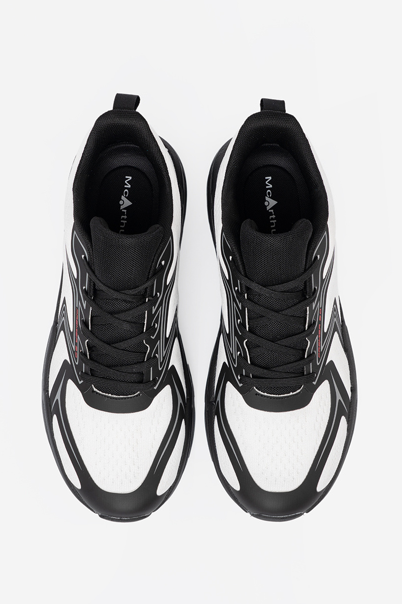 tênis esportivos confortáveis nas cores branca e preta com estrutura de malha McArthur