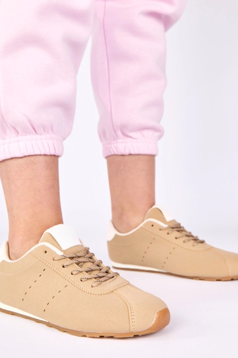 Modelo de tênis com cadarços cor bege e verde Cortes