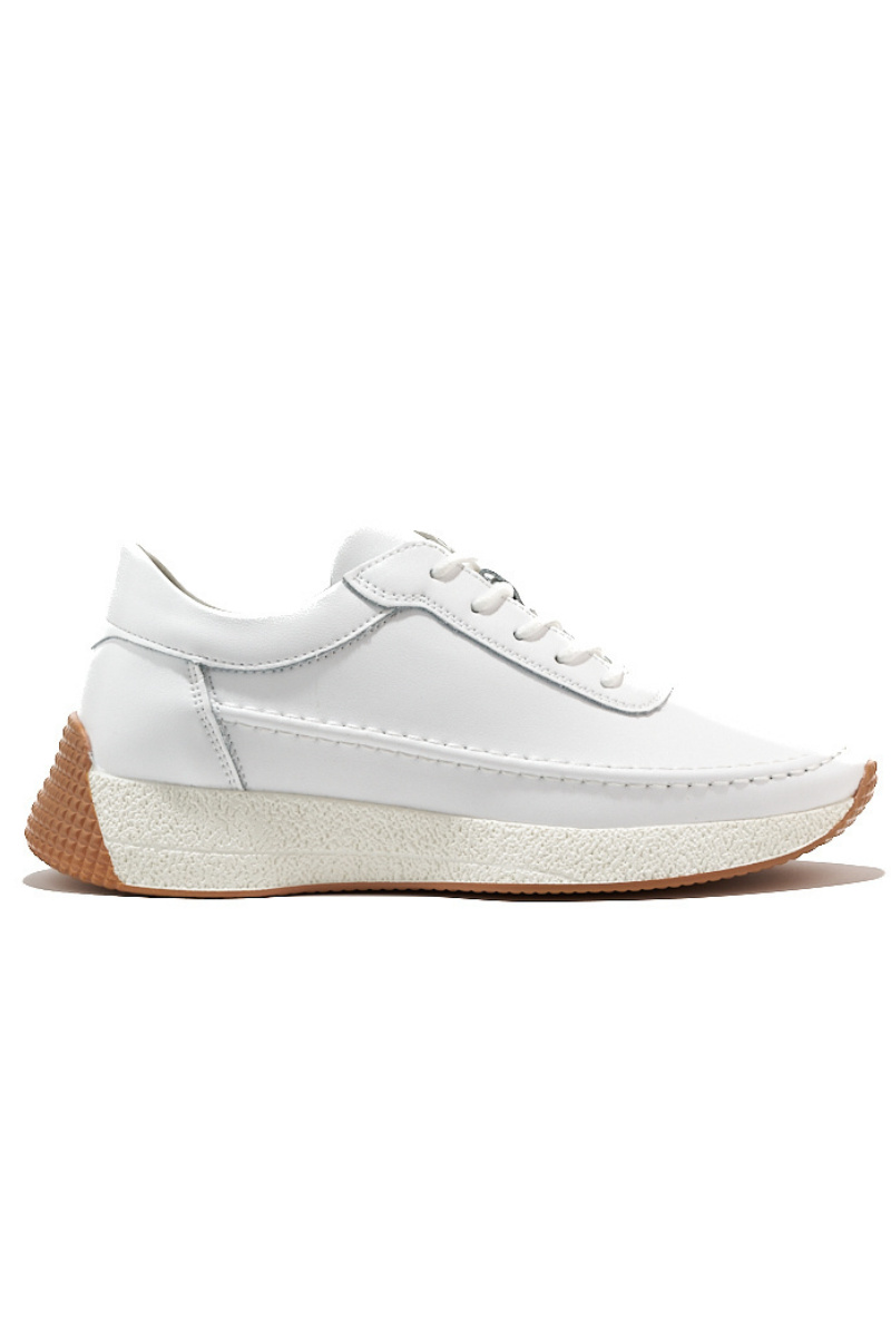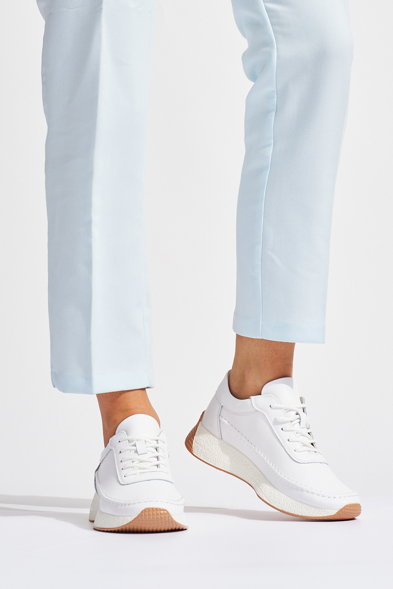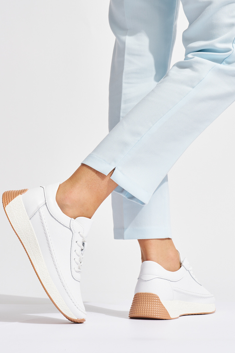 Tênis brancos com detalhes dourados na plataforma Remmi