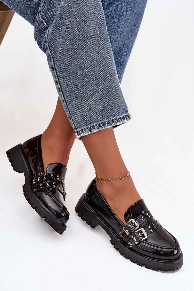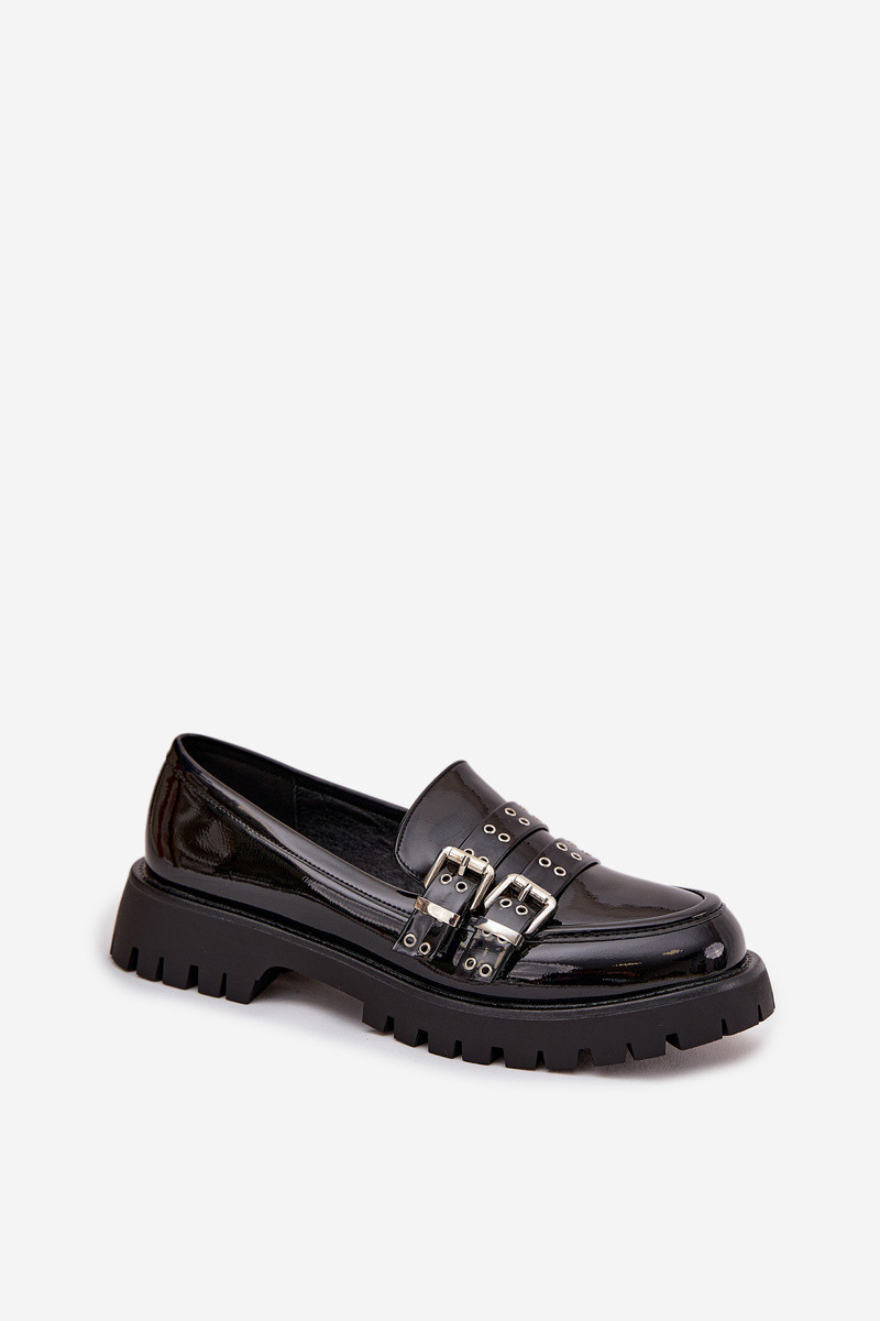 Mocassins femininos com efeito envernizado, tiras e fivelas prateadas na cor preta "Gabrisse"