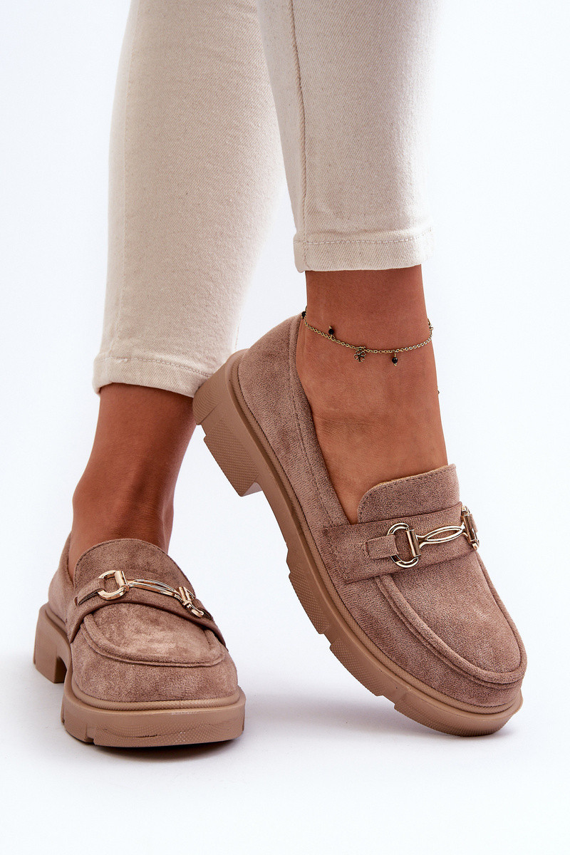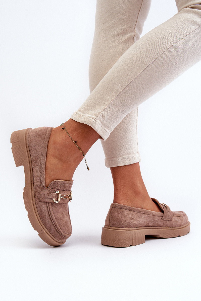 mocassins femininos com detalhes dourados de camurça ecológicaoParae cor marrom Lighas