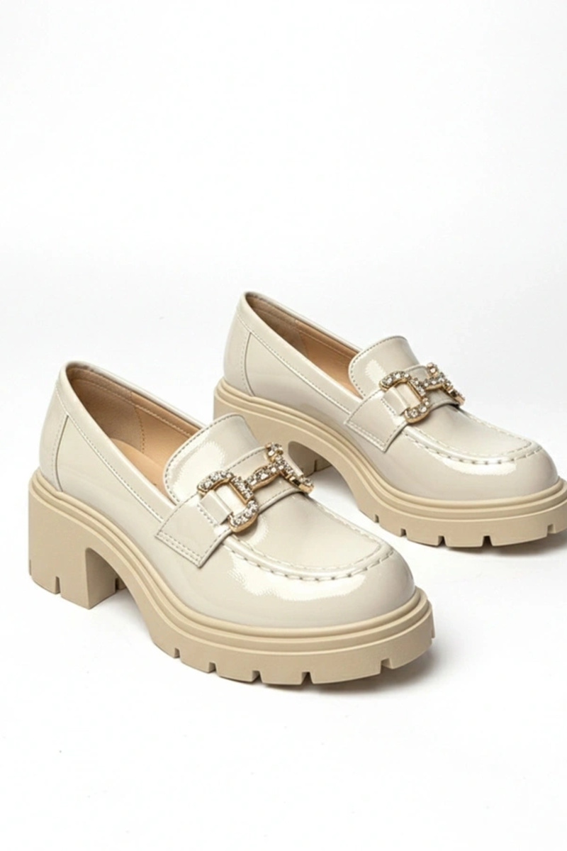 Mocassins cremosos laqueados com salto e zircônias Paola