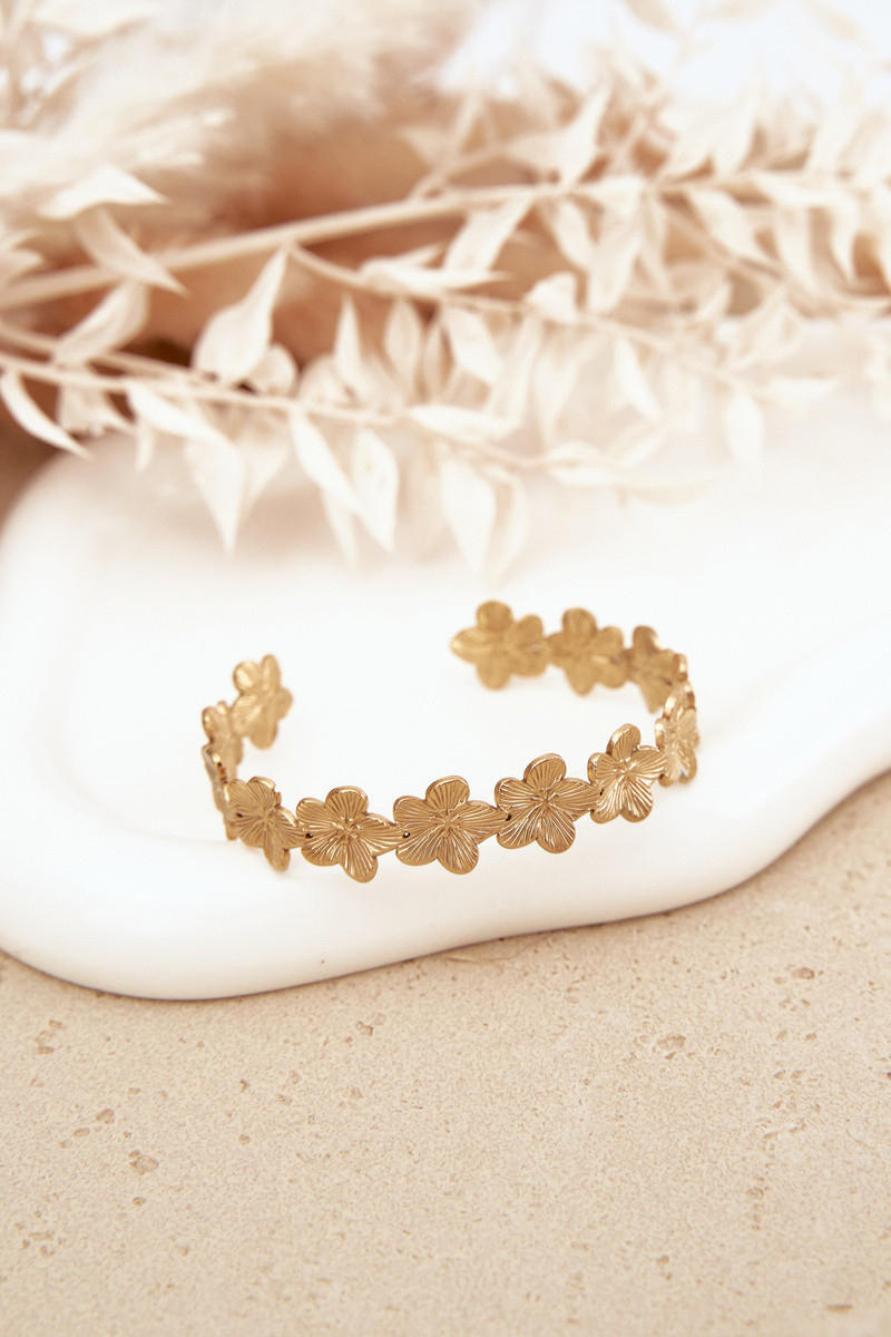 Pulseira feminina de aço inoxidável com motivos florais na cor dourada
