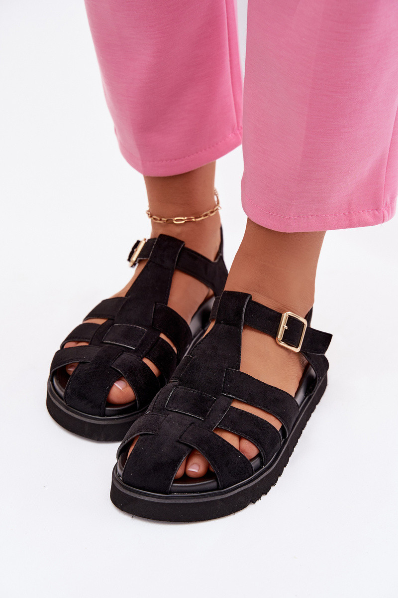 Sandálias romanas femininas com fivelas douradas e plataforma cor preta Terelina