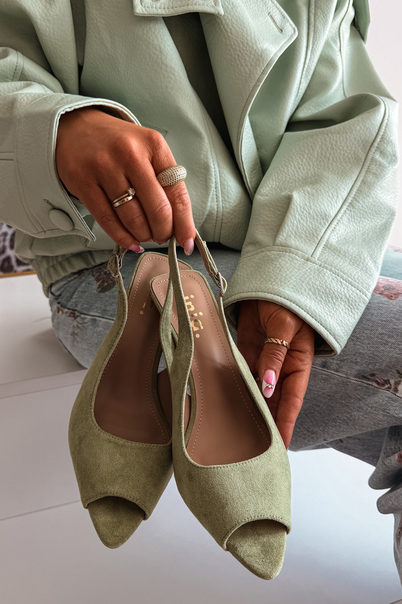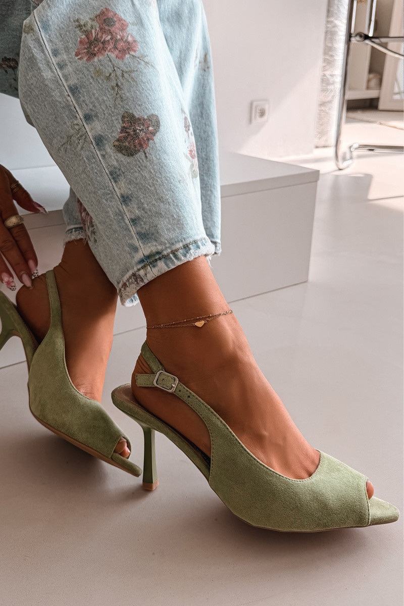 Sandálias femininas com salto fino de camurça ecológicaoParae cor verde Sevina