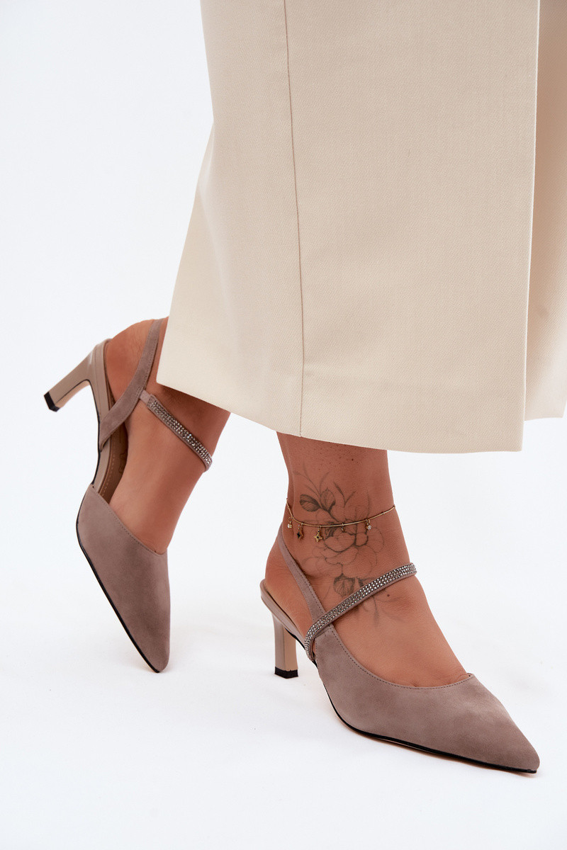 Sapatos de salto elegantes em camurça de cor areia com tiras decorativas D&A