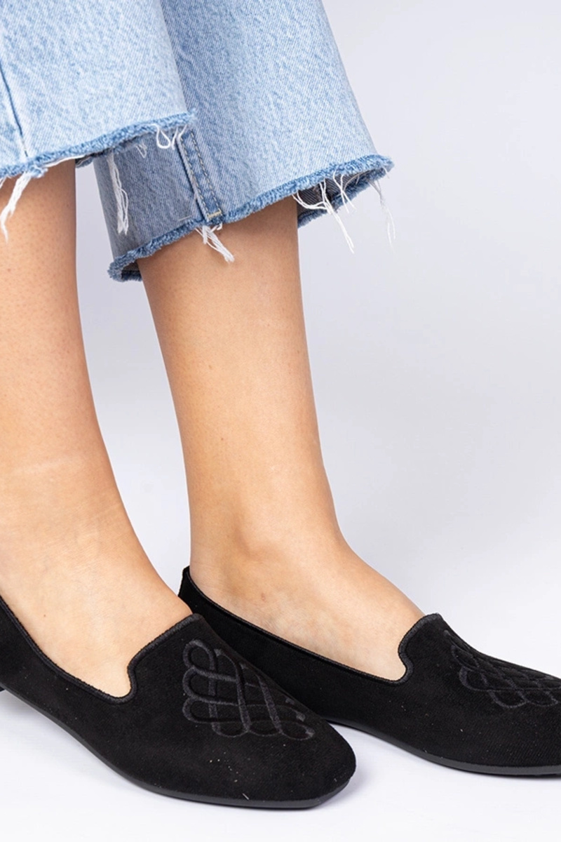 Sapatilhas femininas pretas de camurça com bordado Ronna