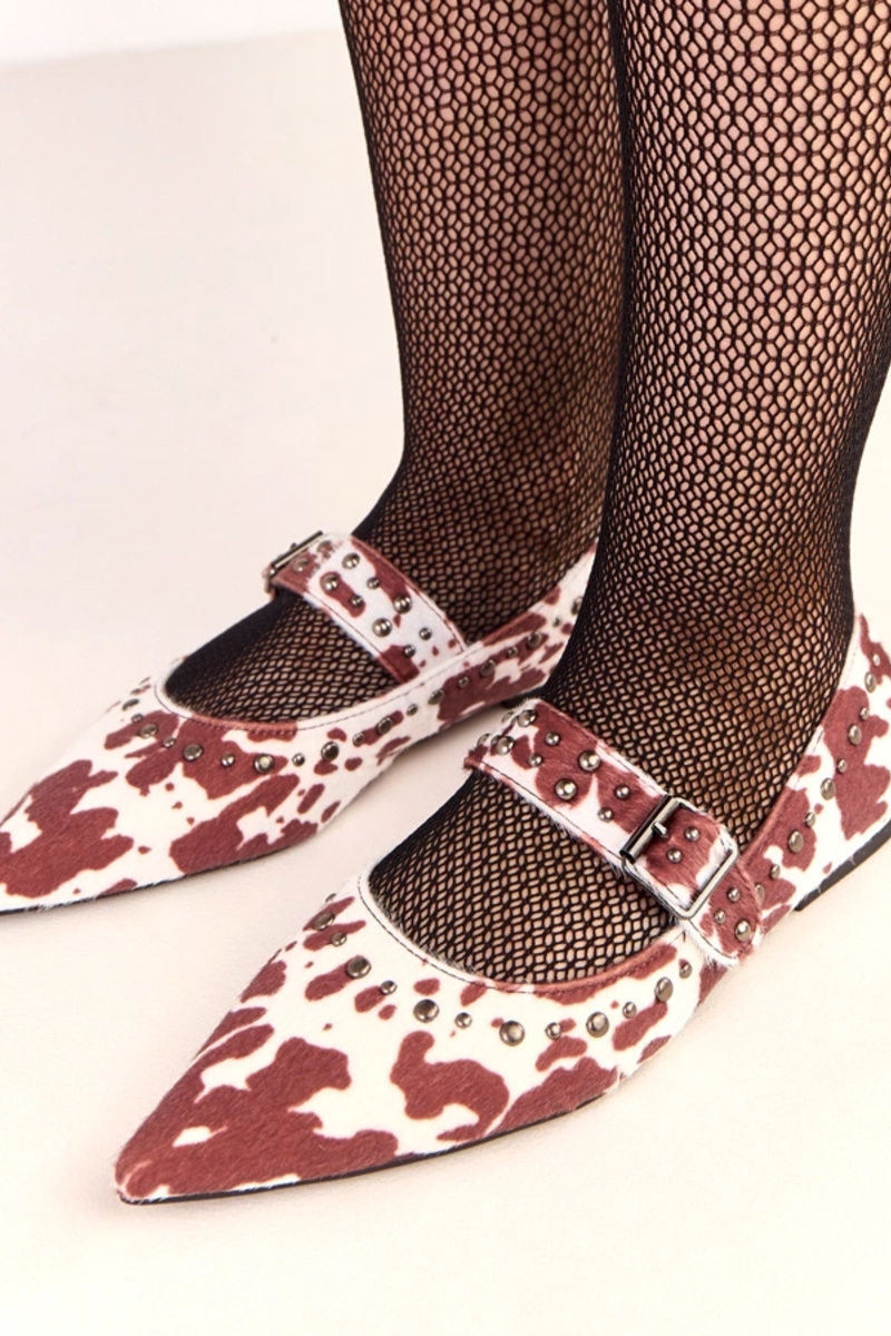 Balerinas Loresi marrons com estampa de manchas de vaca decoradas com tachas