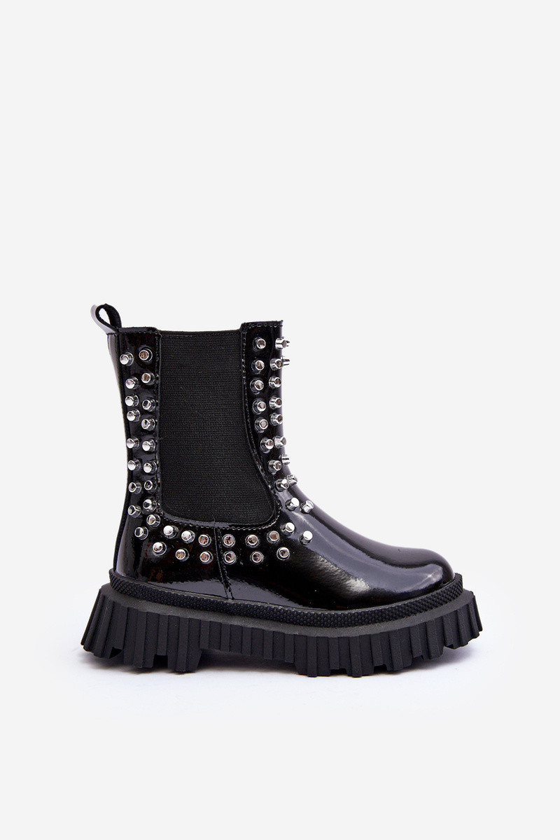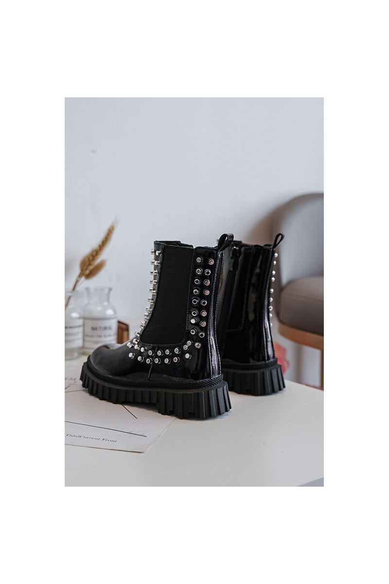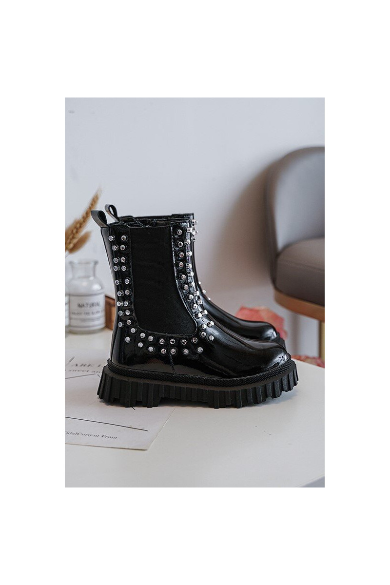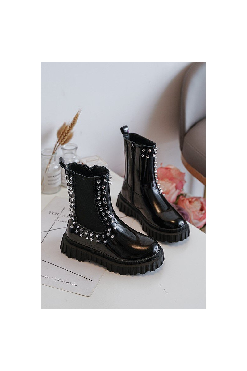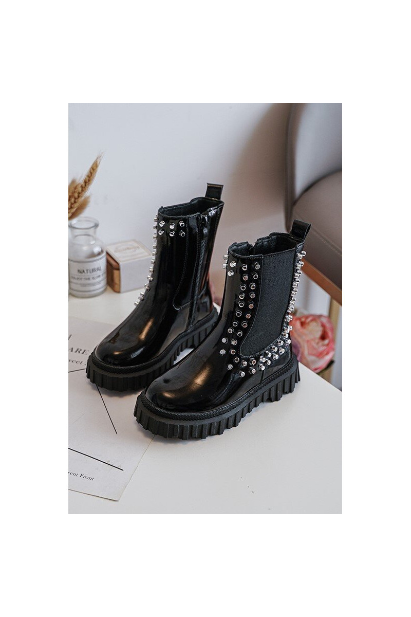 Botas infantis estilosas com efeito de verniz decoradas com strass na cor preta Adelie