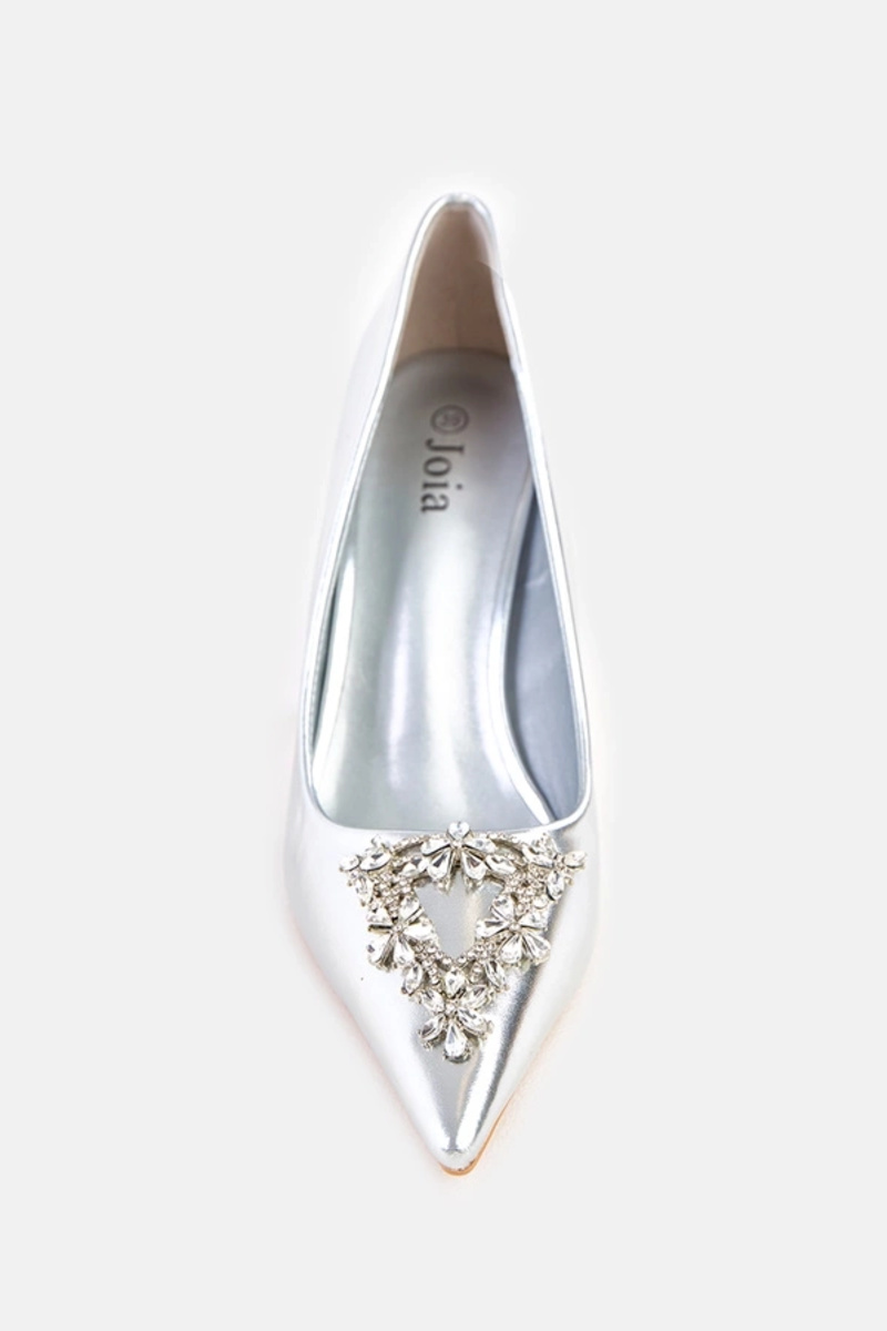 Sapatos de salto alto prateados envernizados, decorados com zircônias Almana
