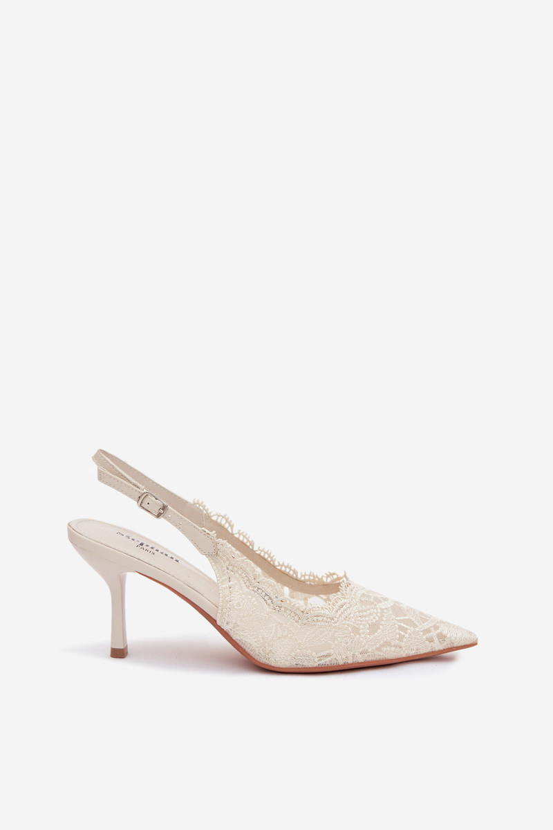 Sandálias rendadas com saltinhos finos em tom marfim Carielle